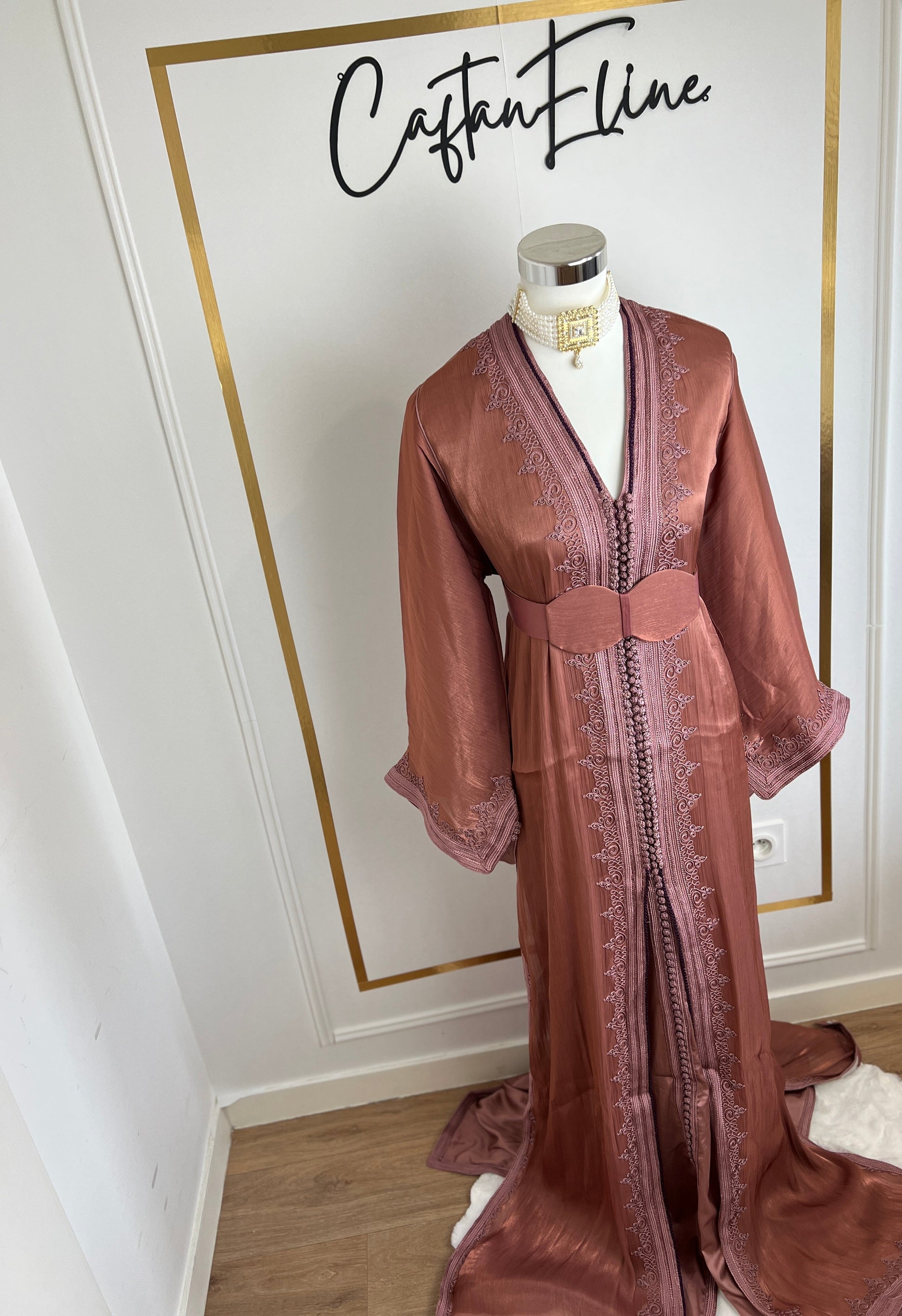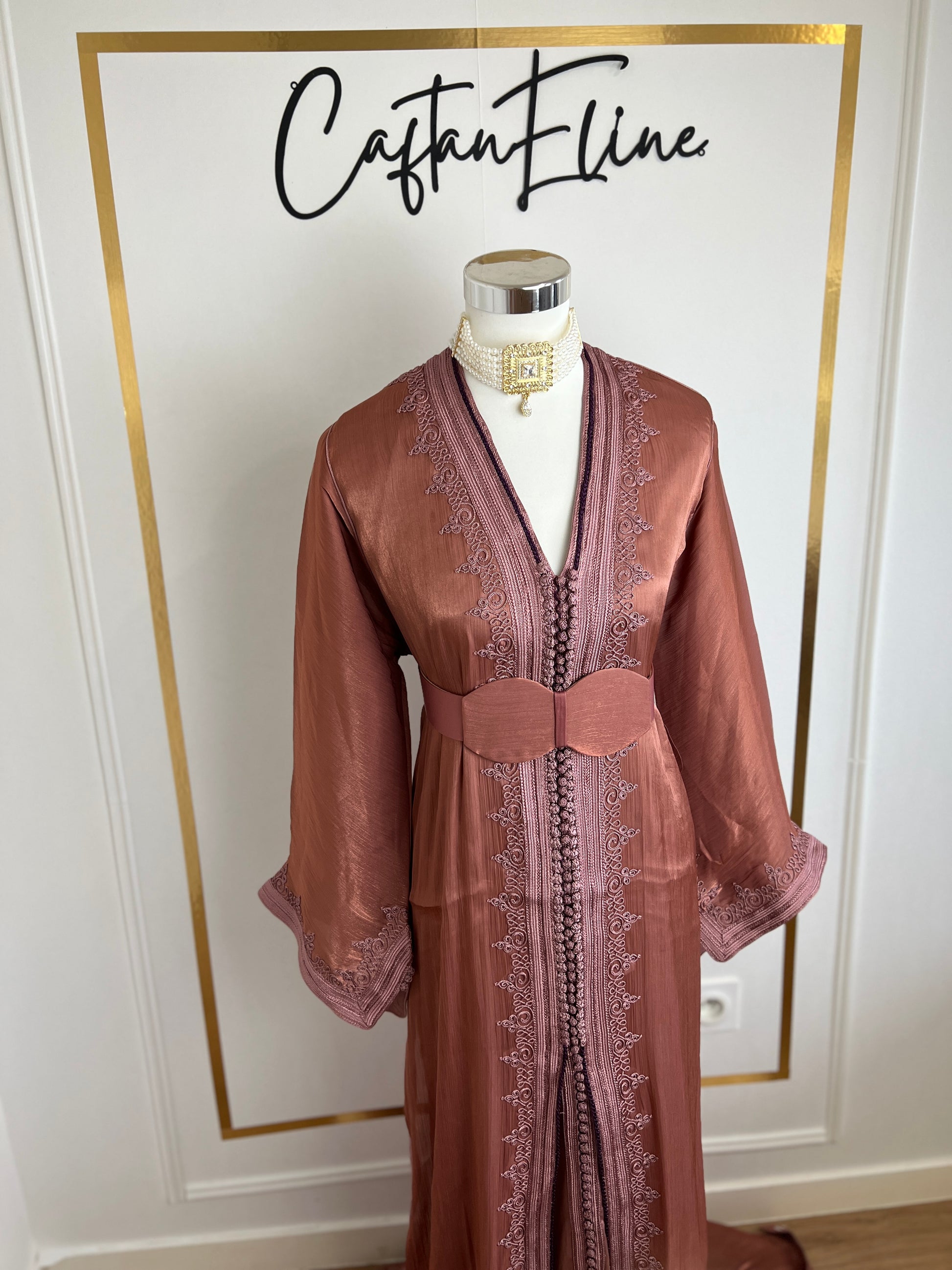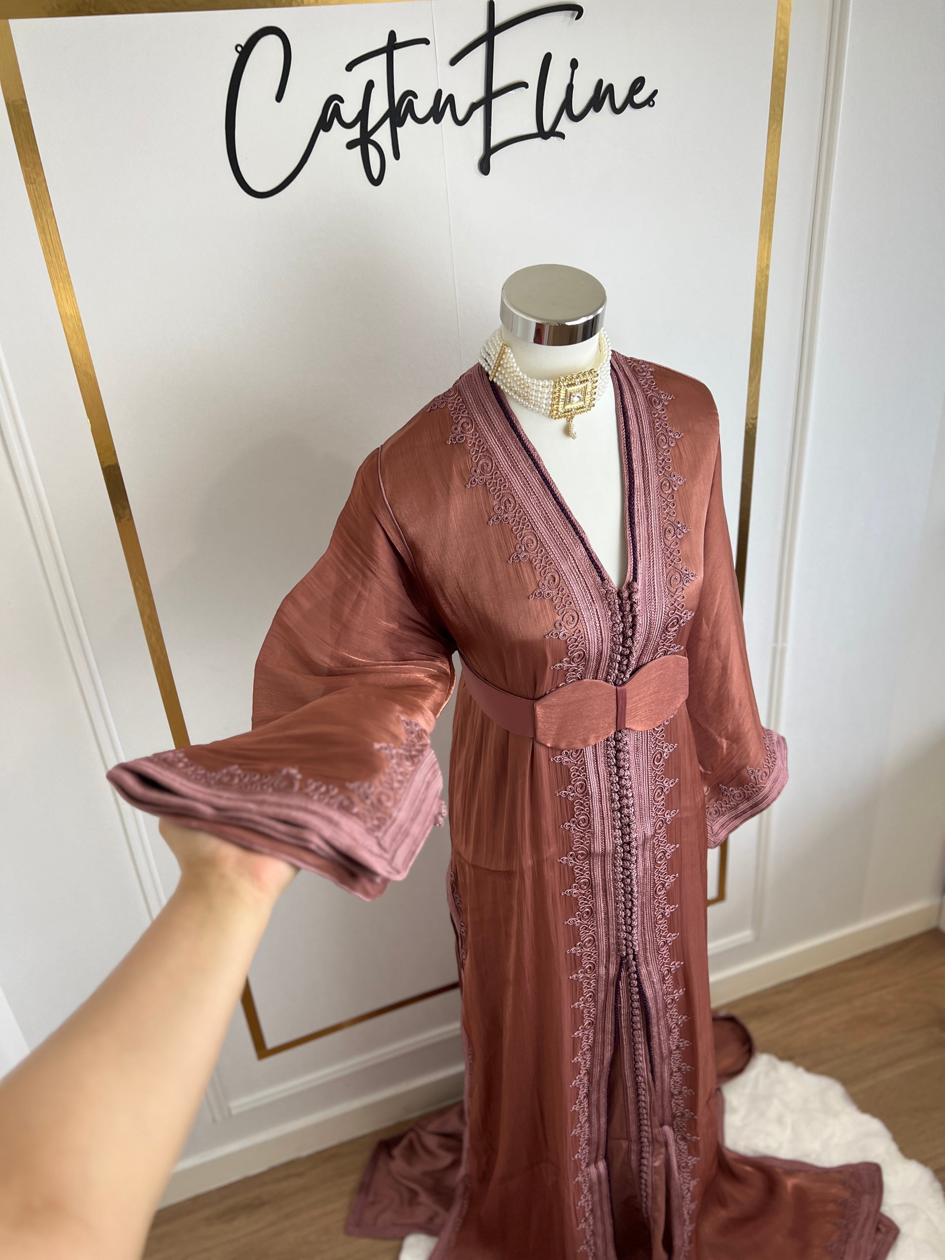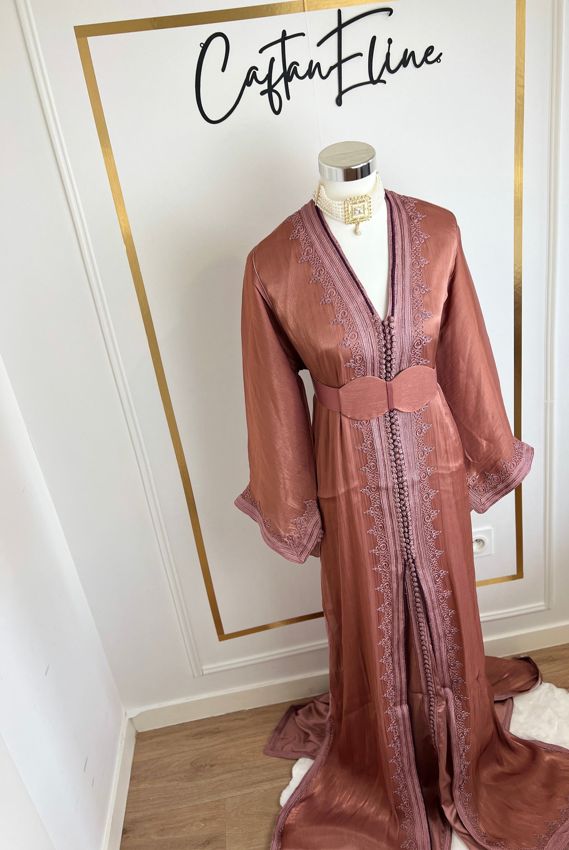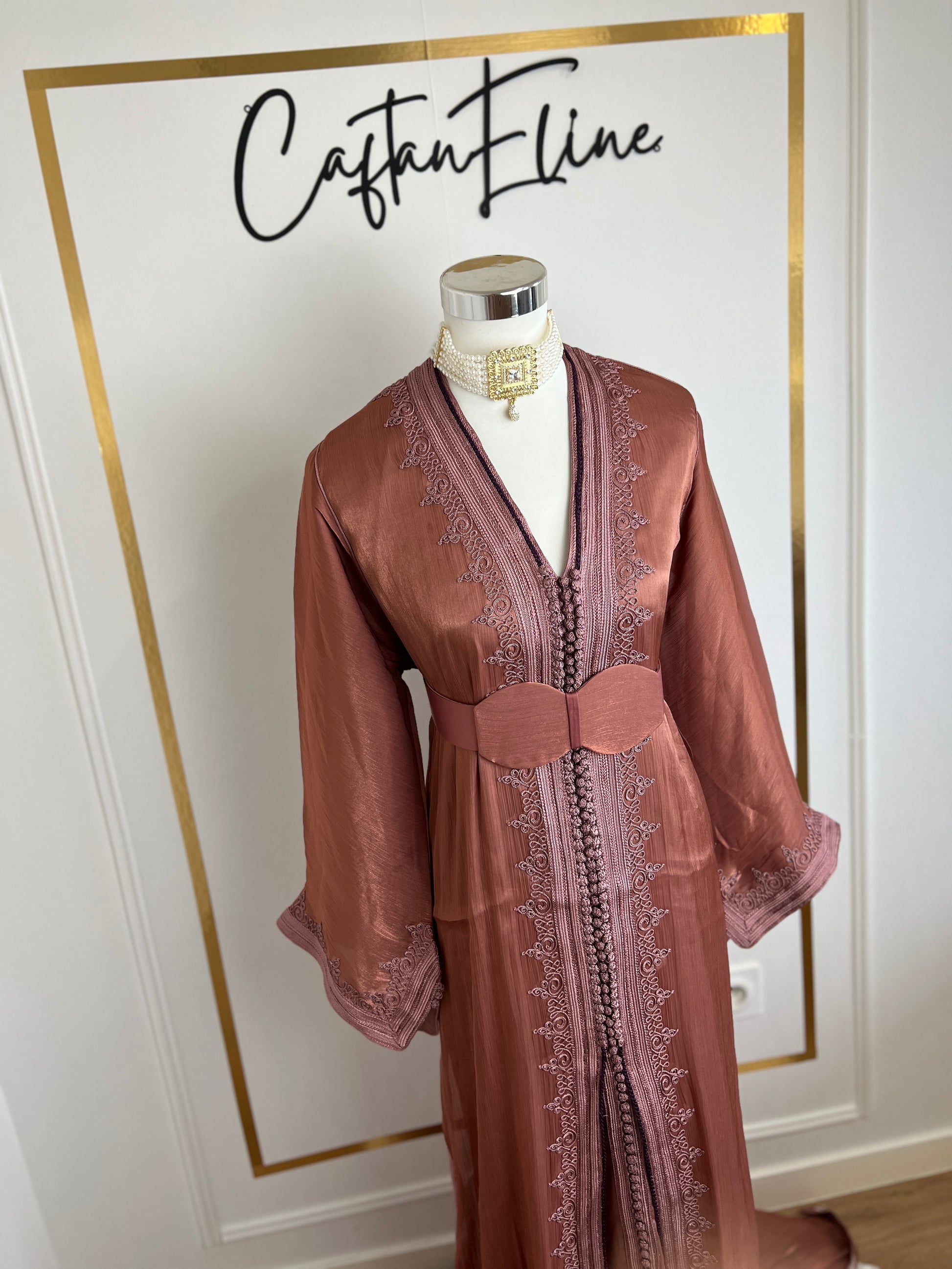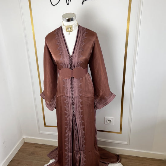 this caftan combines the charm of Moroccan craftsmanship with a contemporary touch,