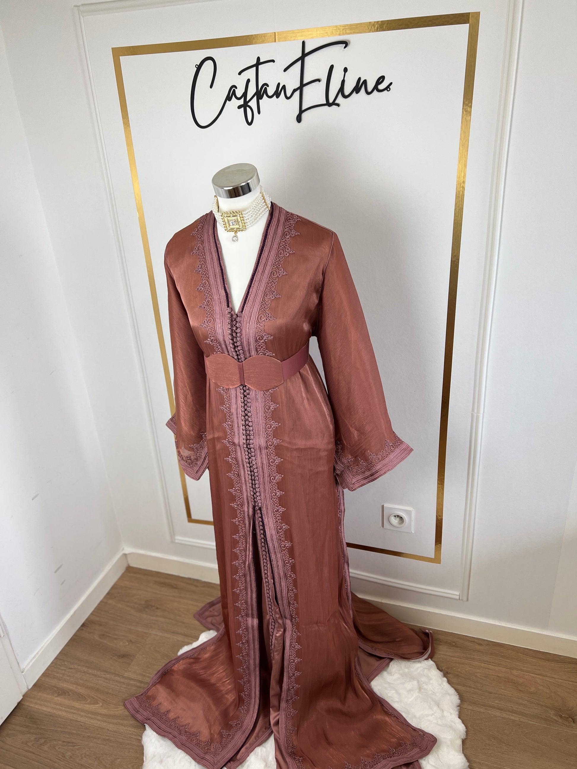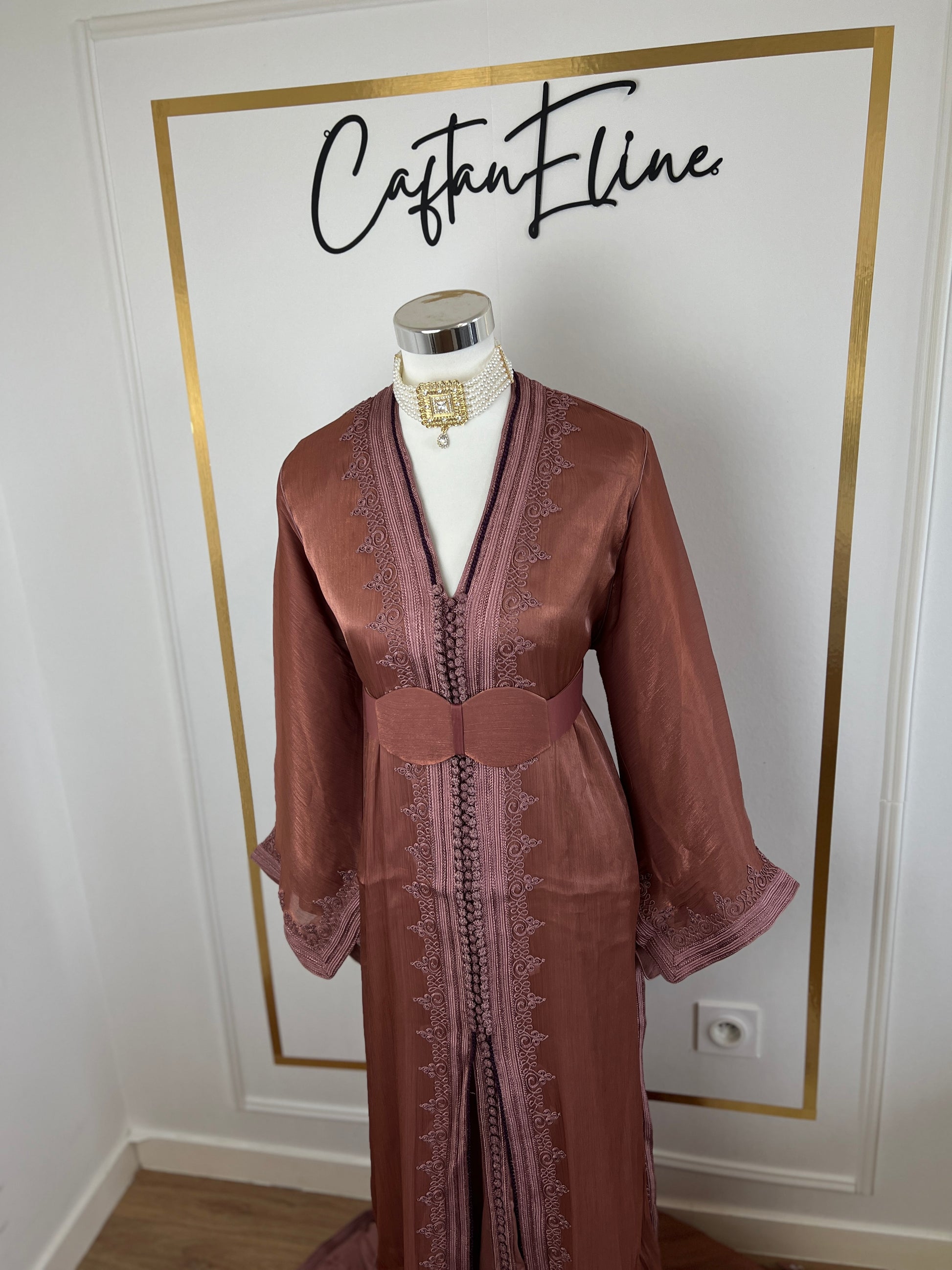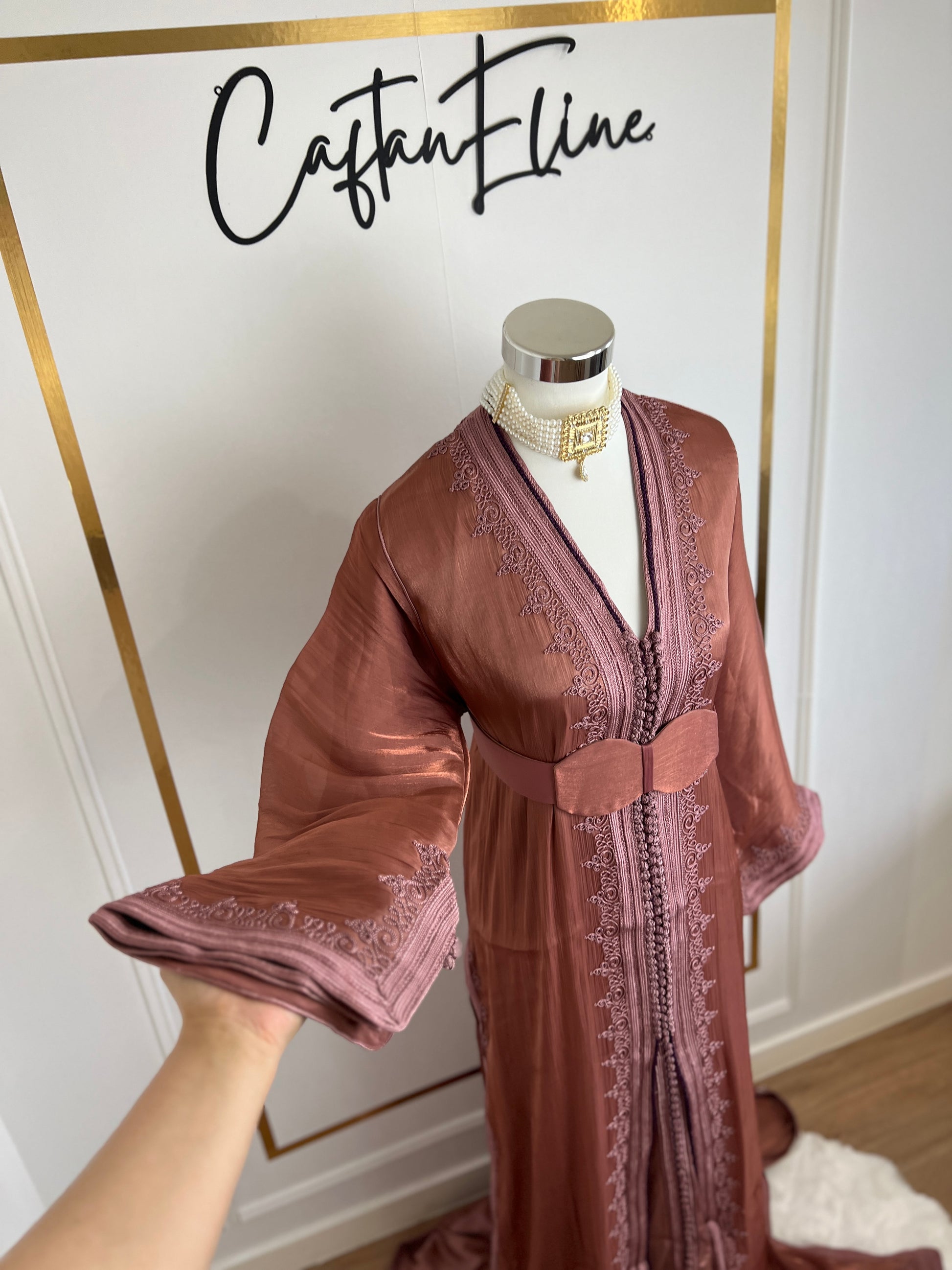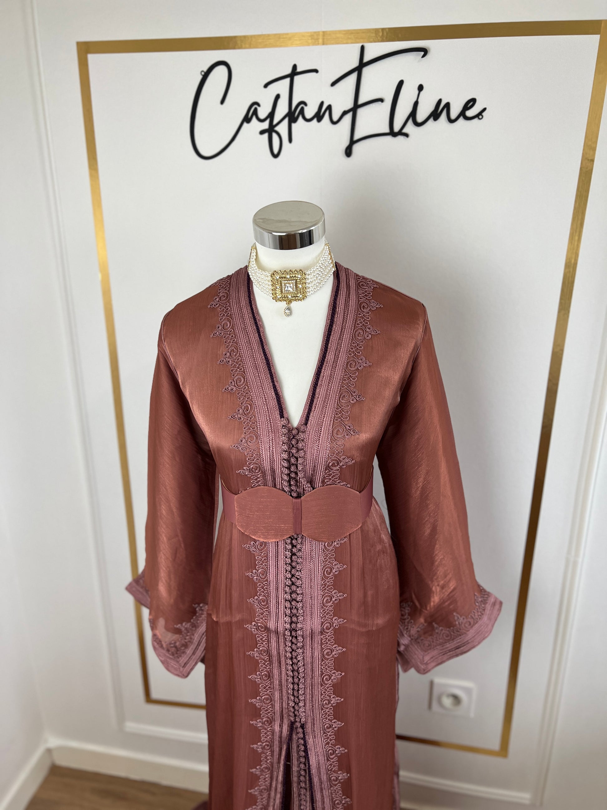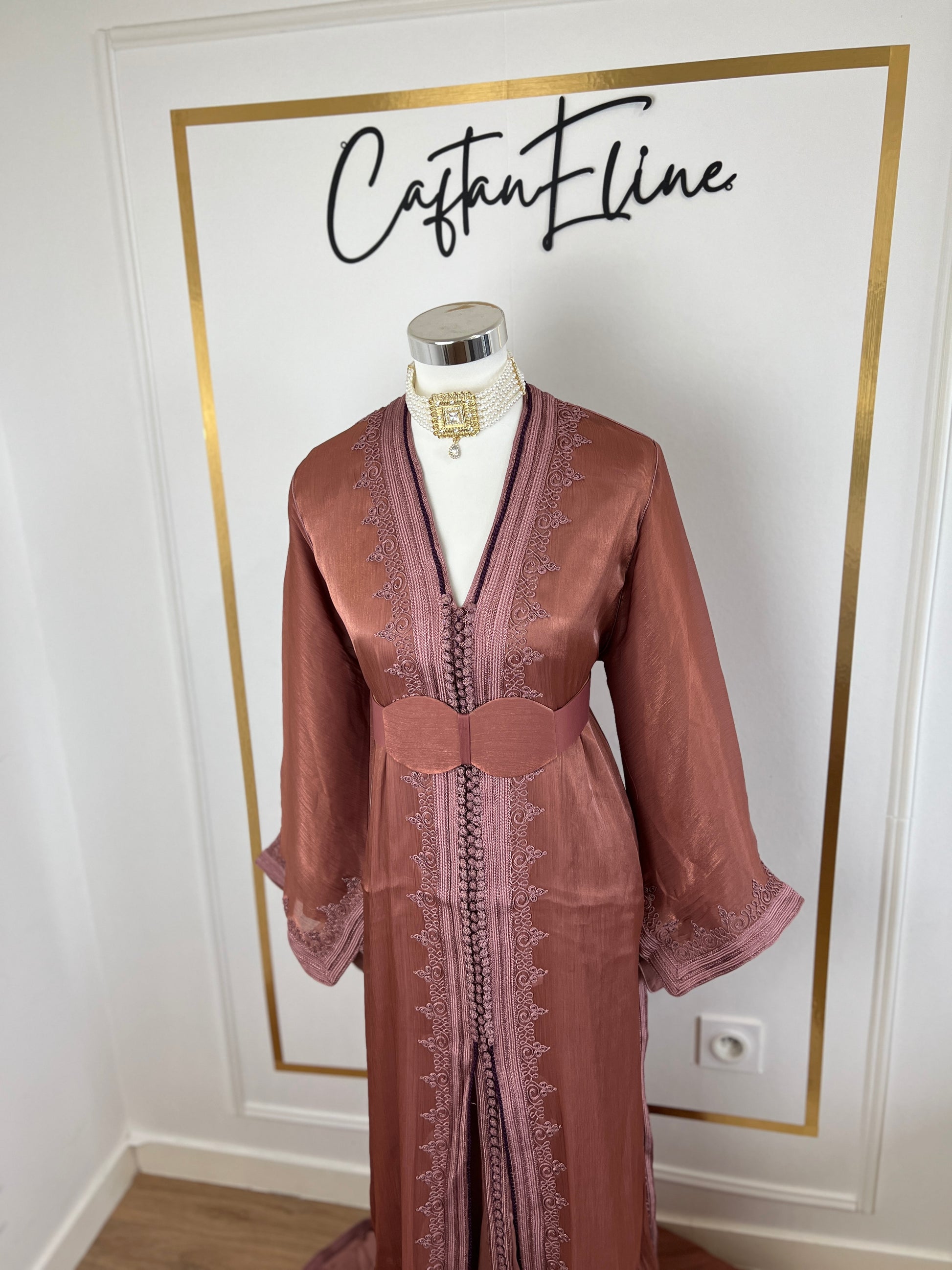 this caftan combines the charm of Moroccan craftsmanship with a contemporary touch,