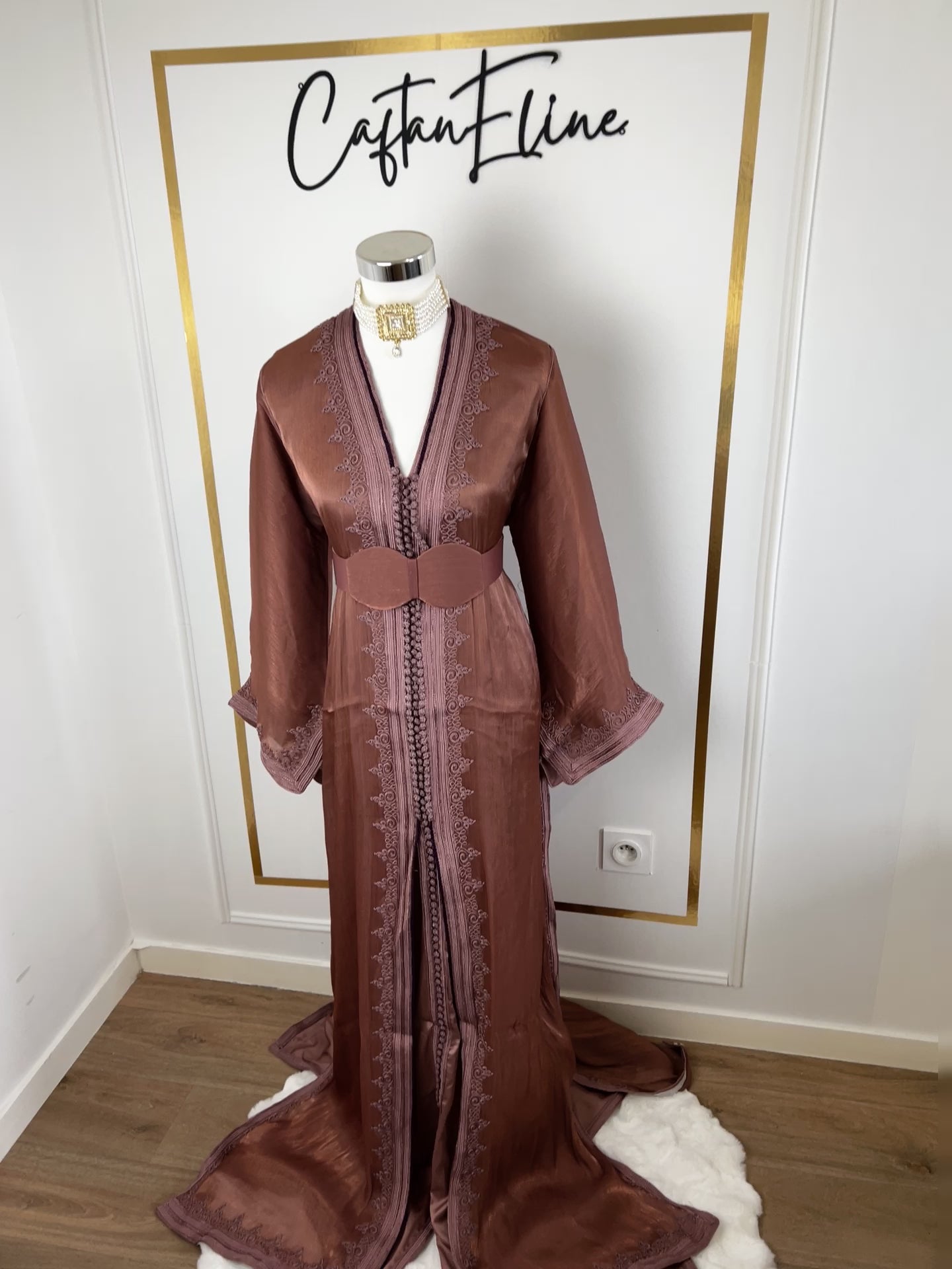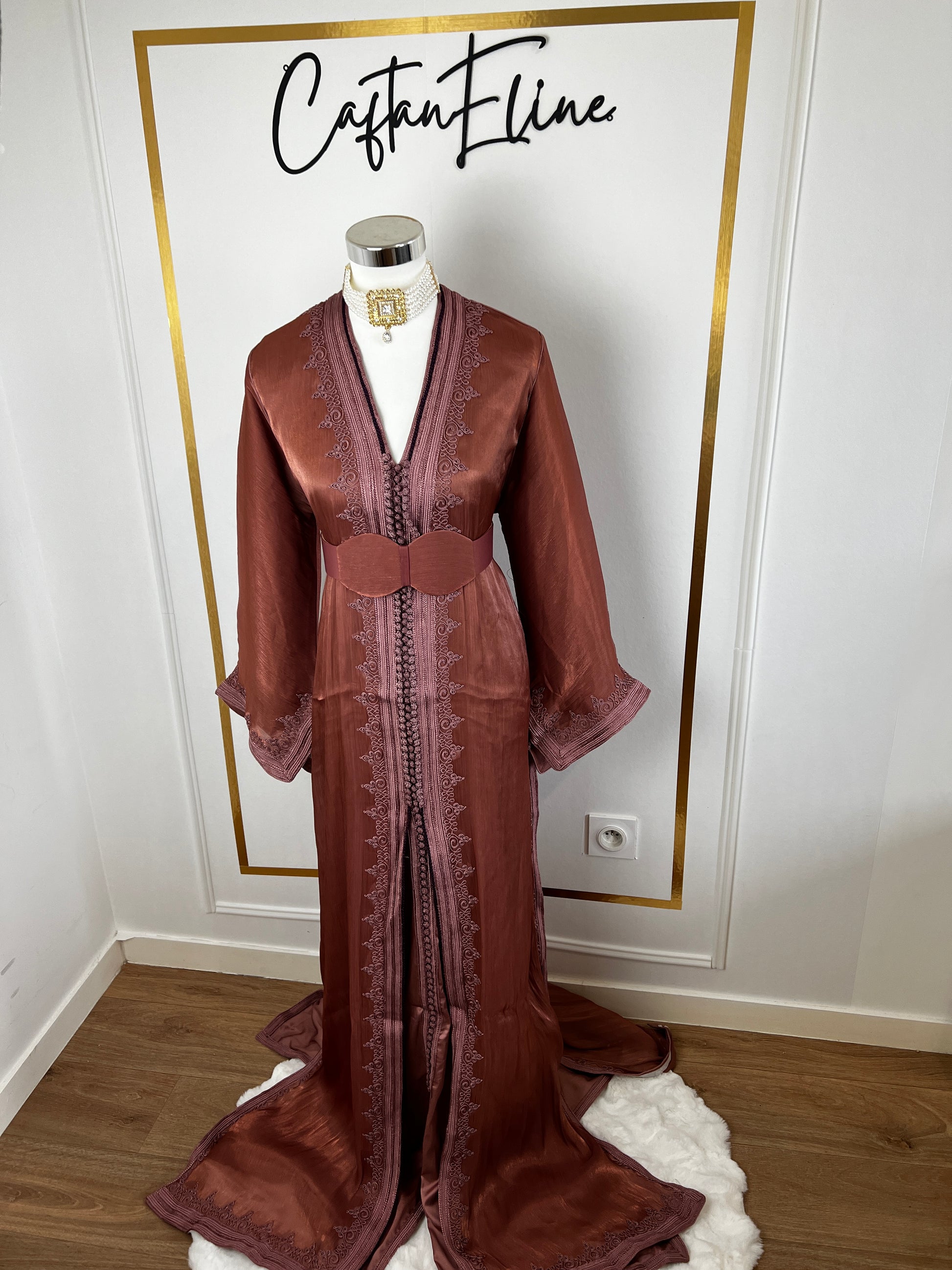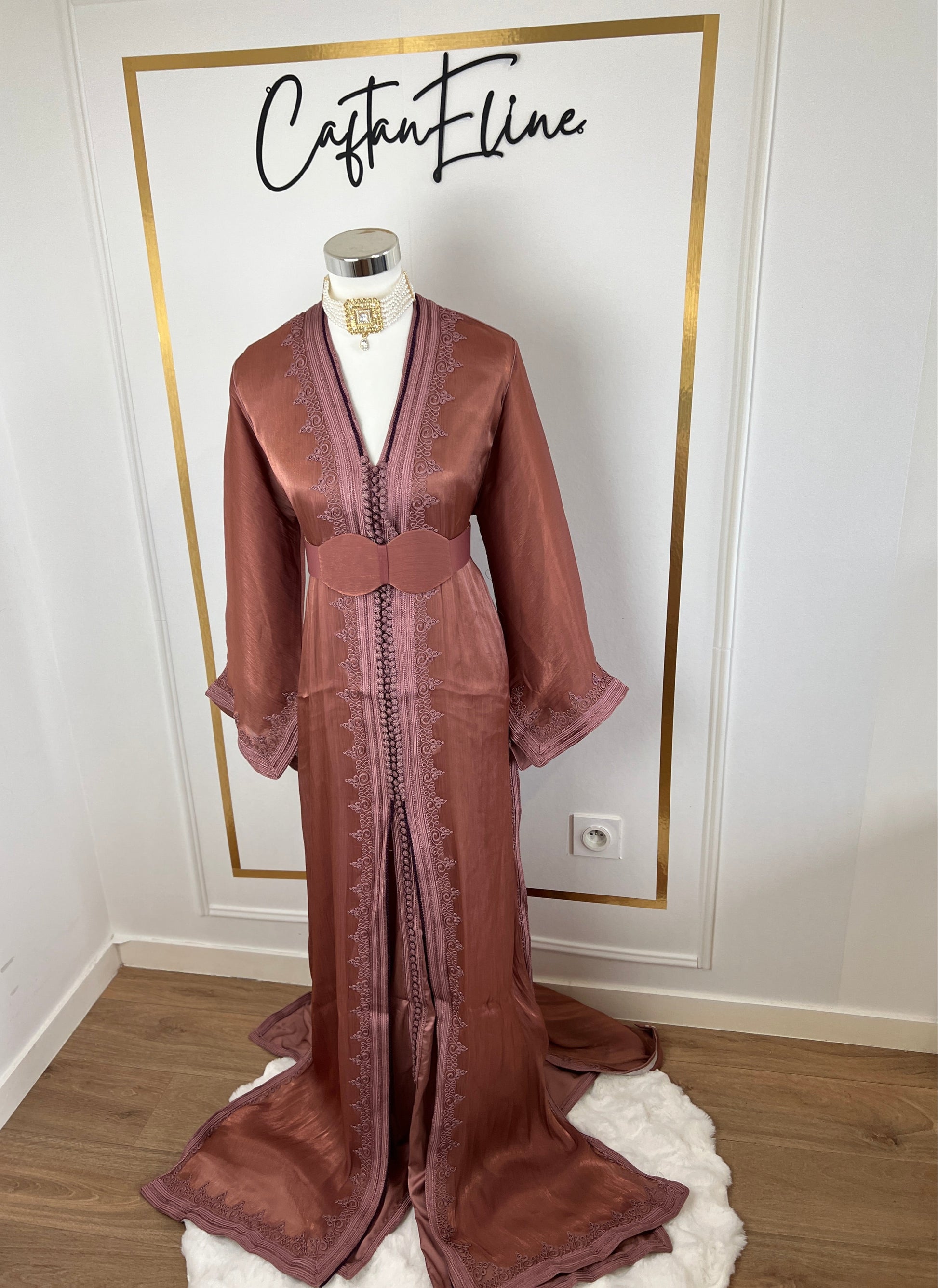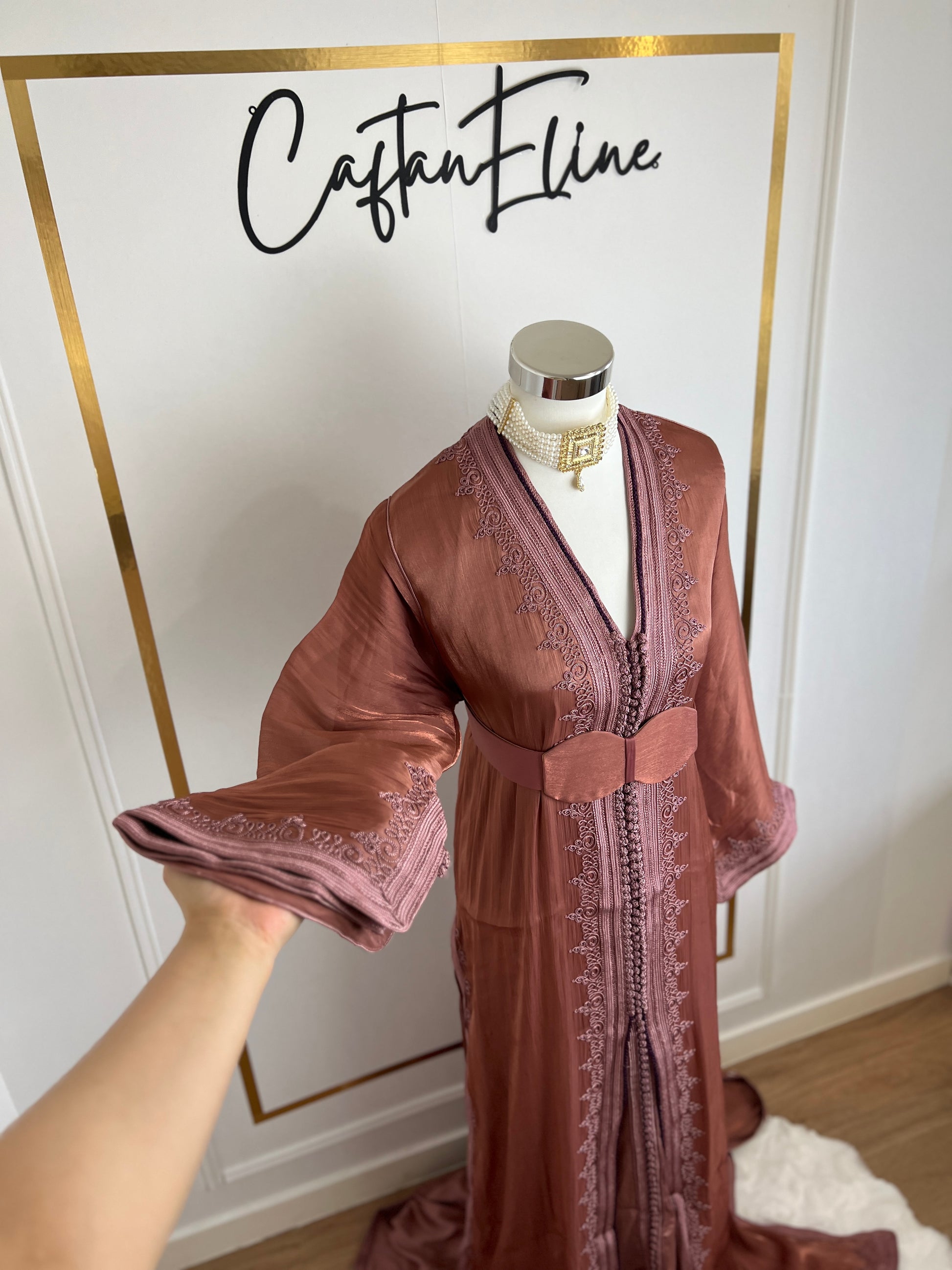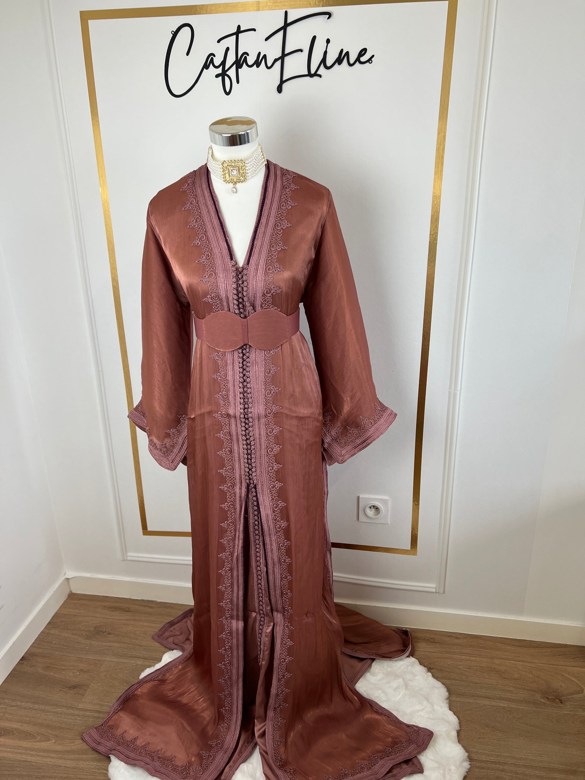 this caftan combines the charm of Moroccan craftsmanship with a contemporary touch,