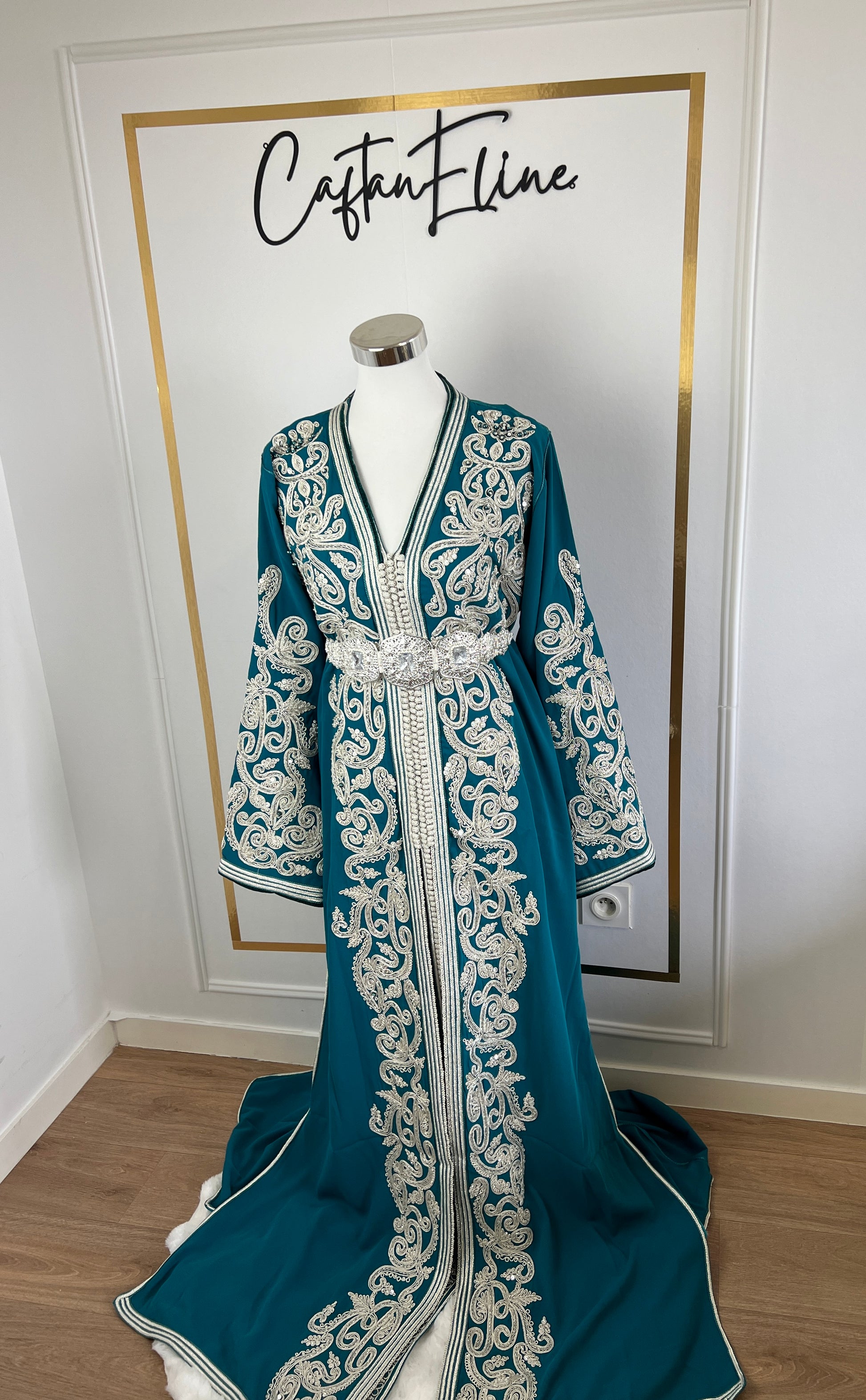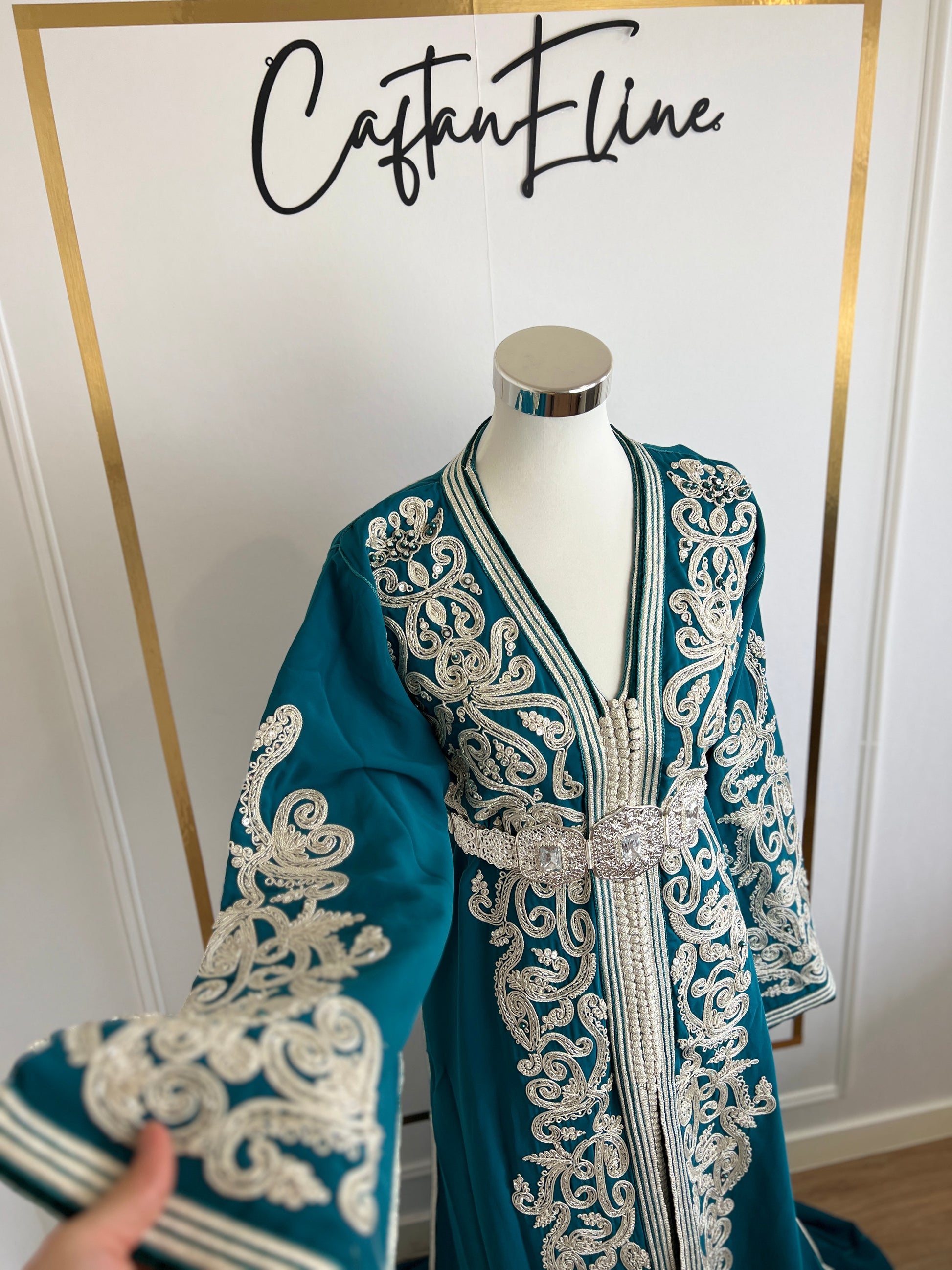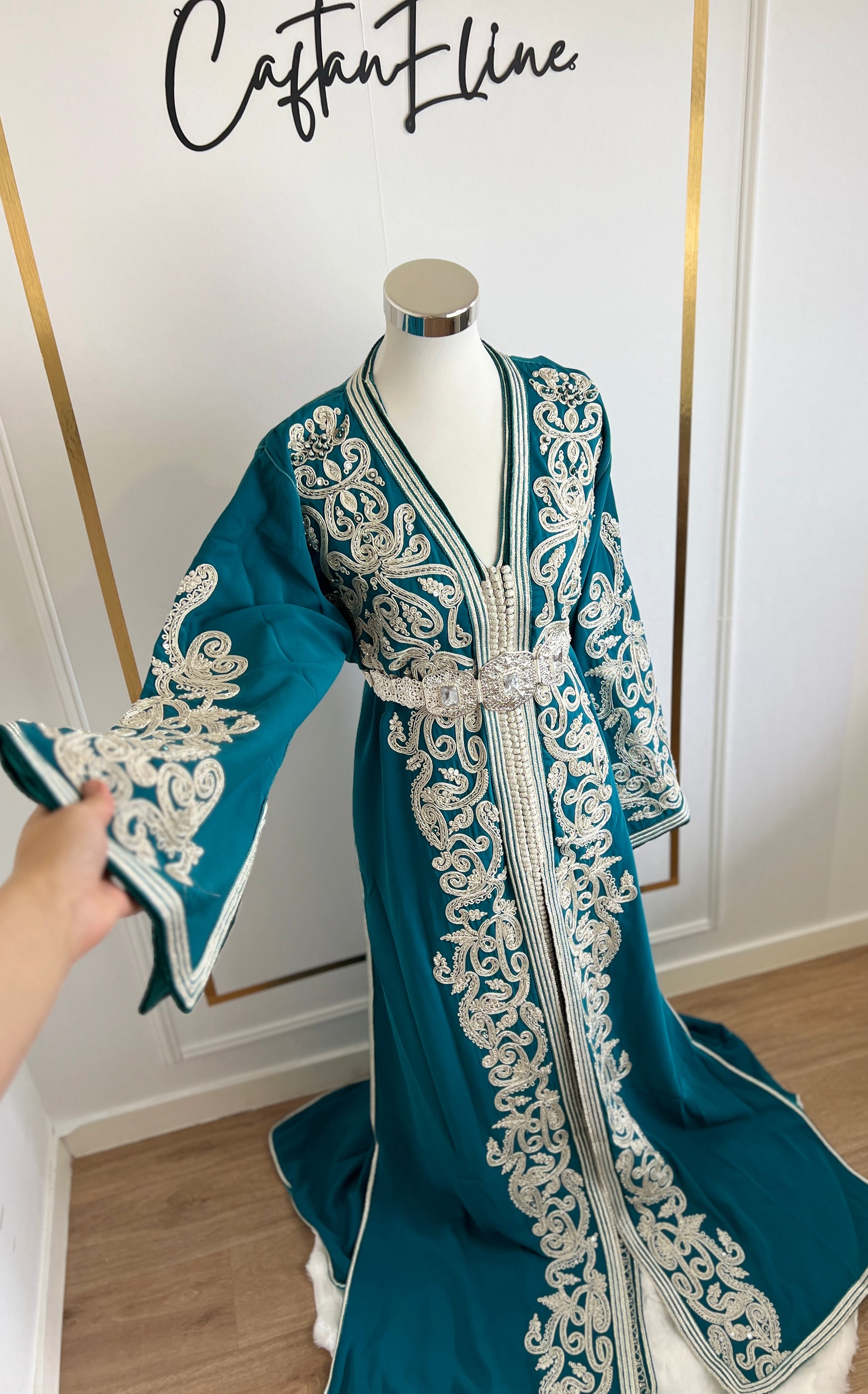 this caftan combines the charm of Moroccan craftsmanship with a contemporary touch,