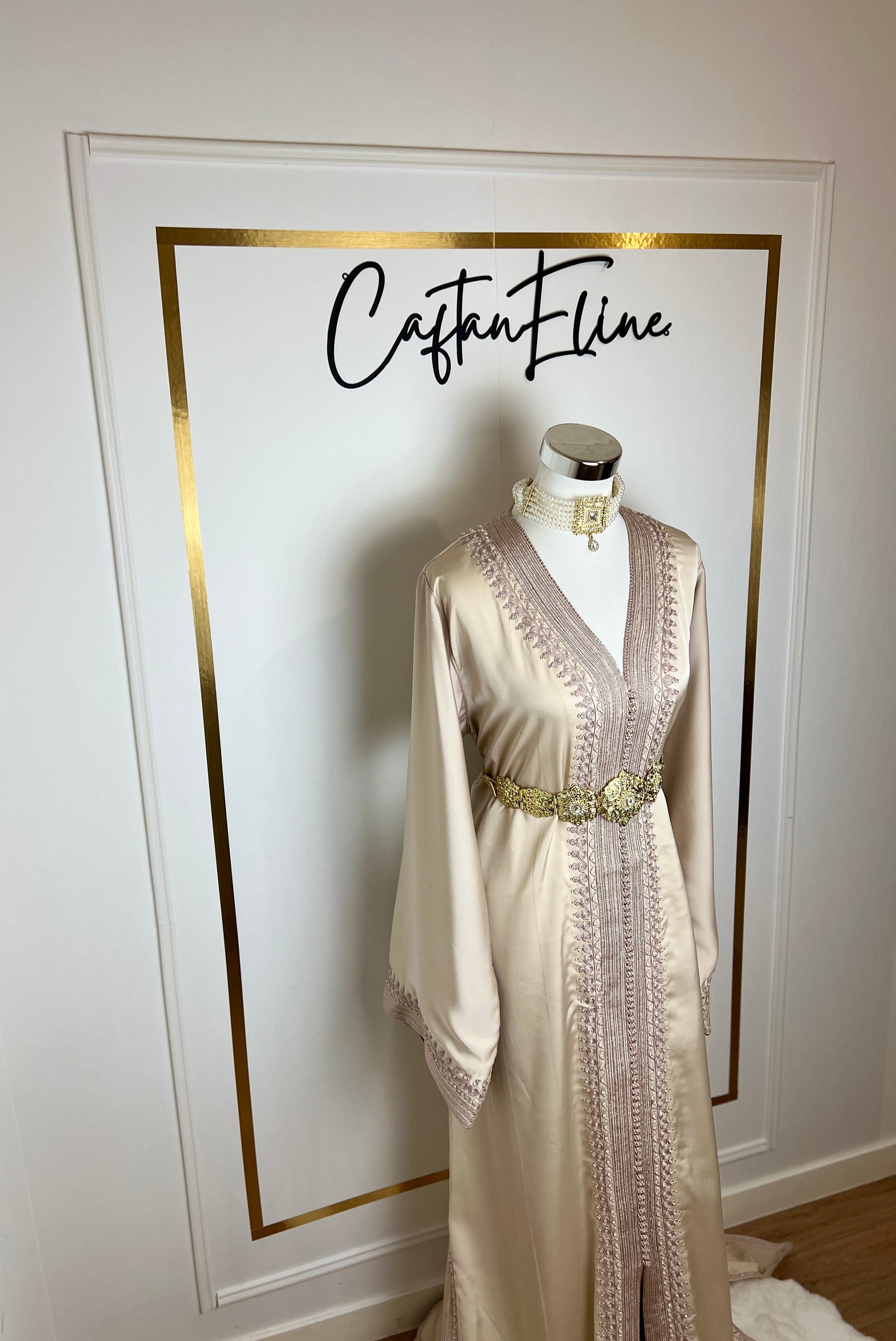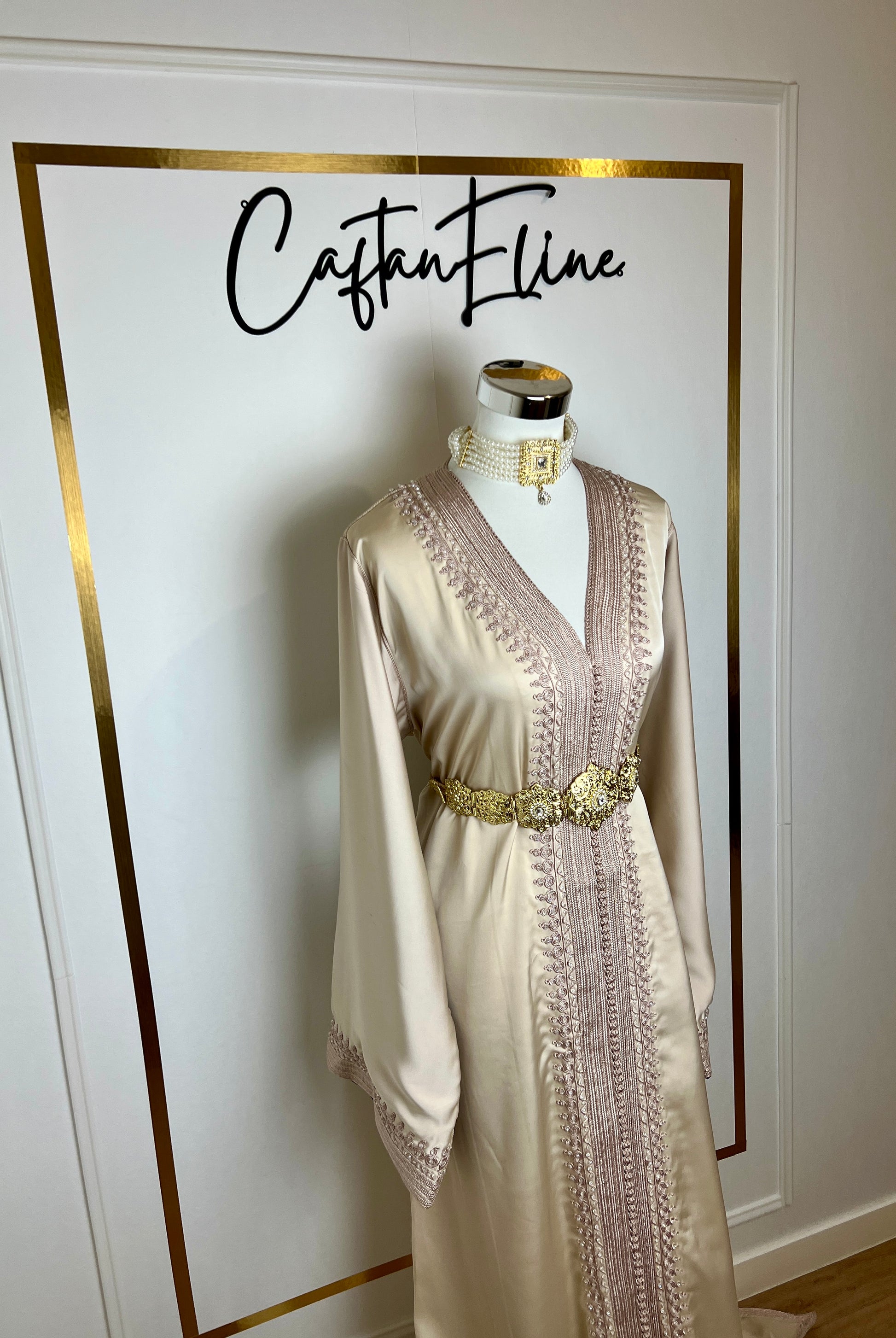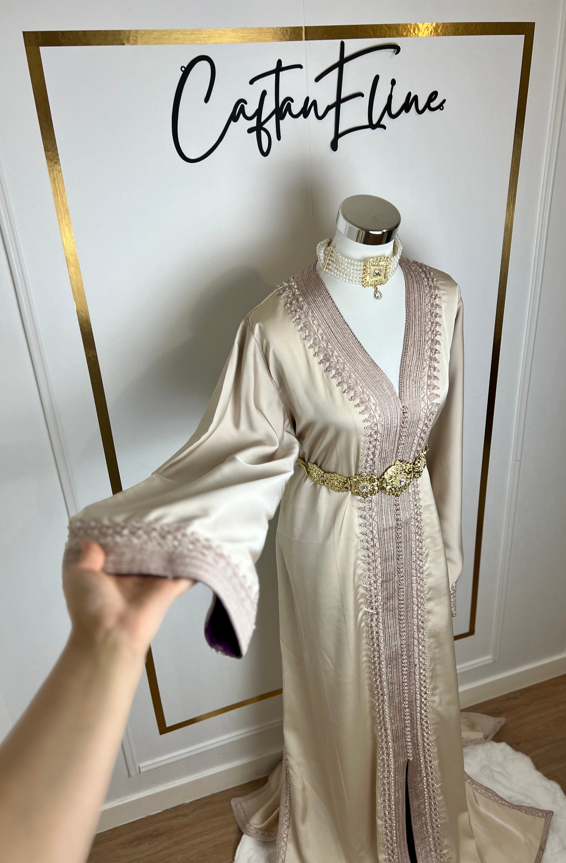 this caftan combines the charm of Moroccan craftsmanship with a contemporary touch,