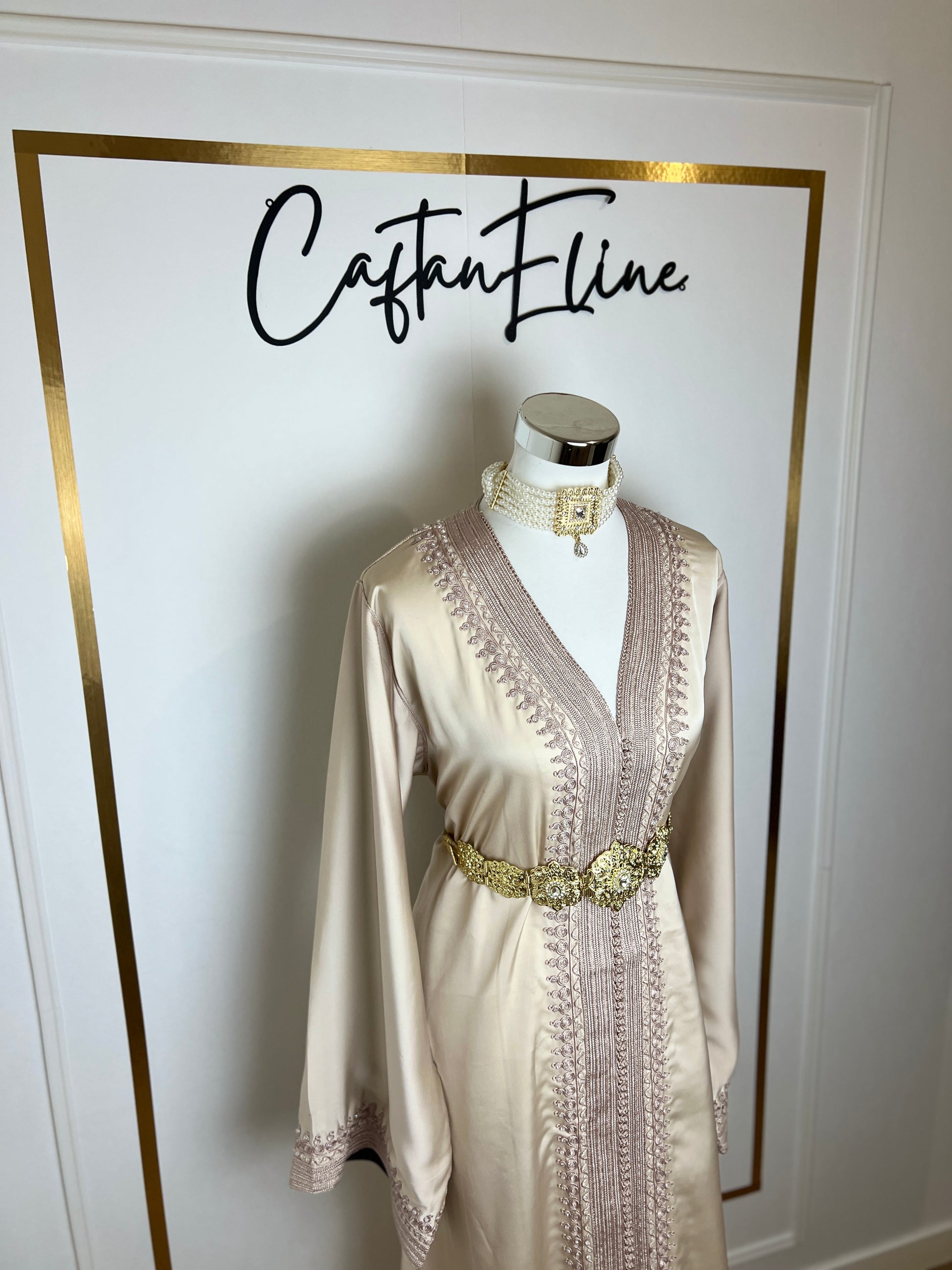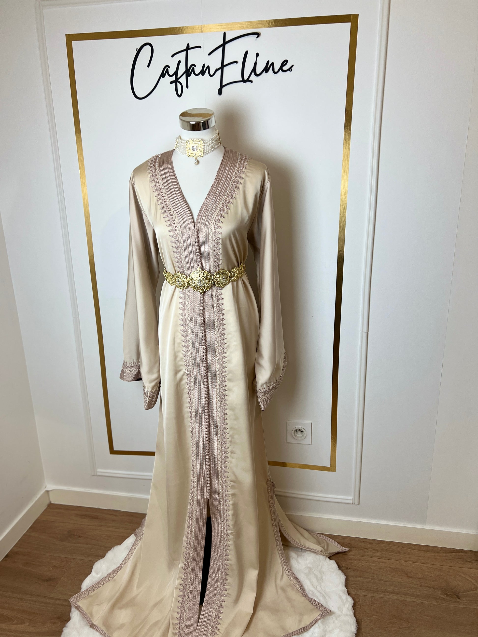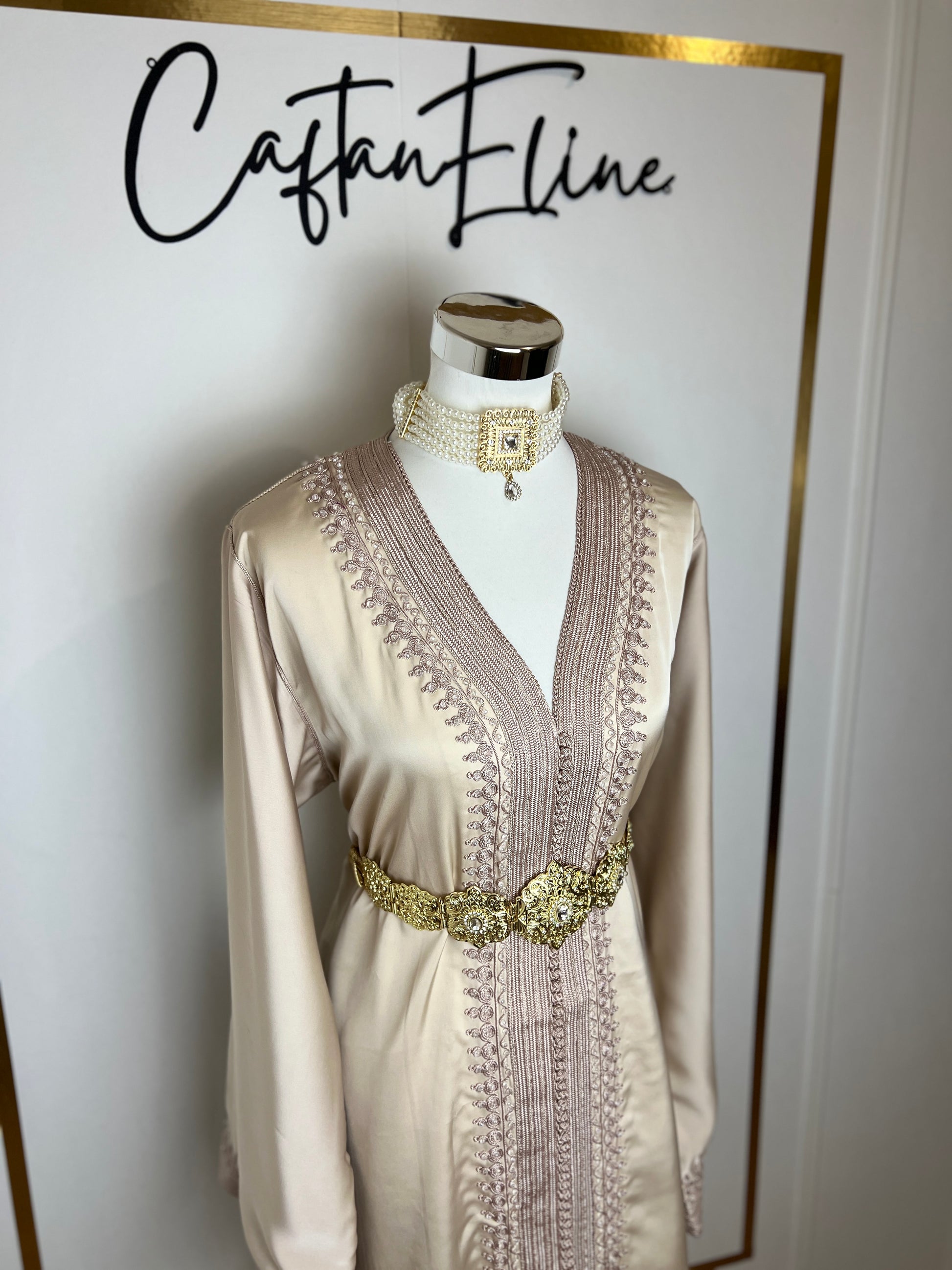 this caftan combines the charm of Moroccan craftsmanship with a contemporary touch,
