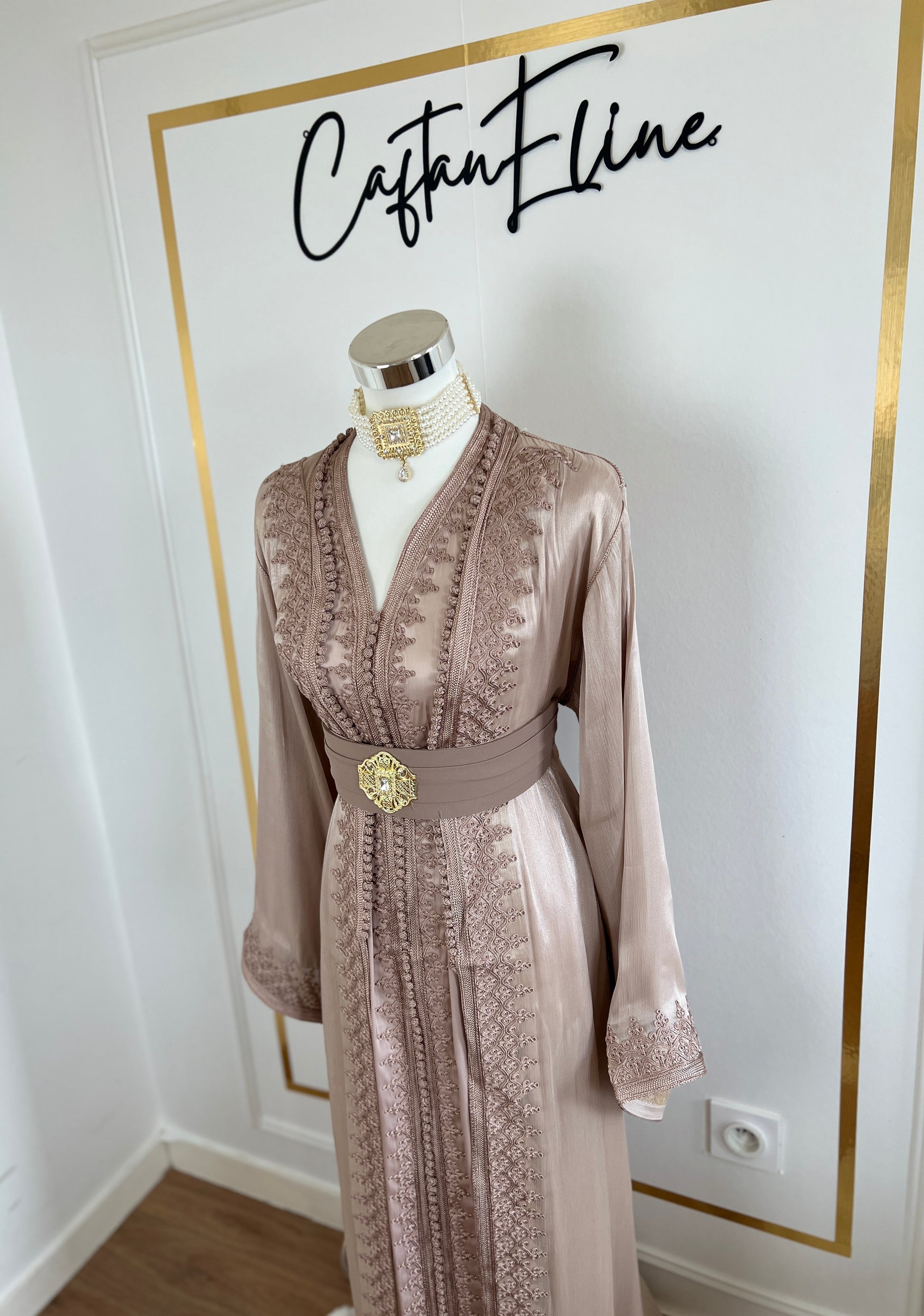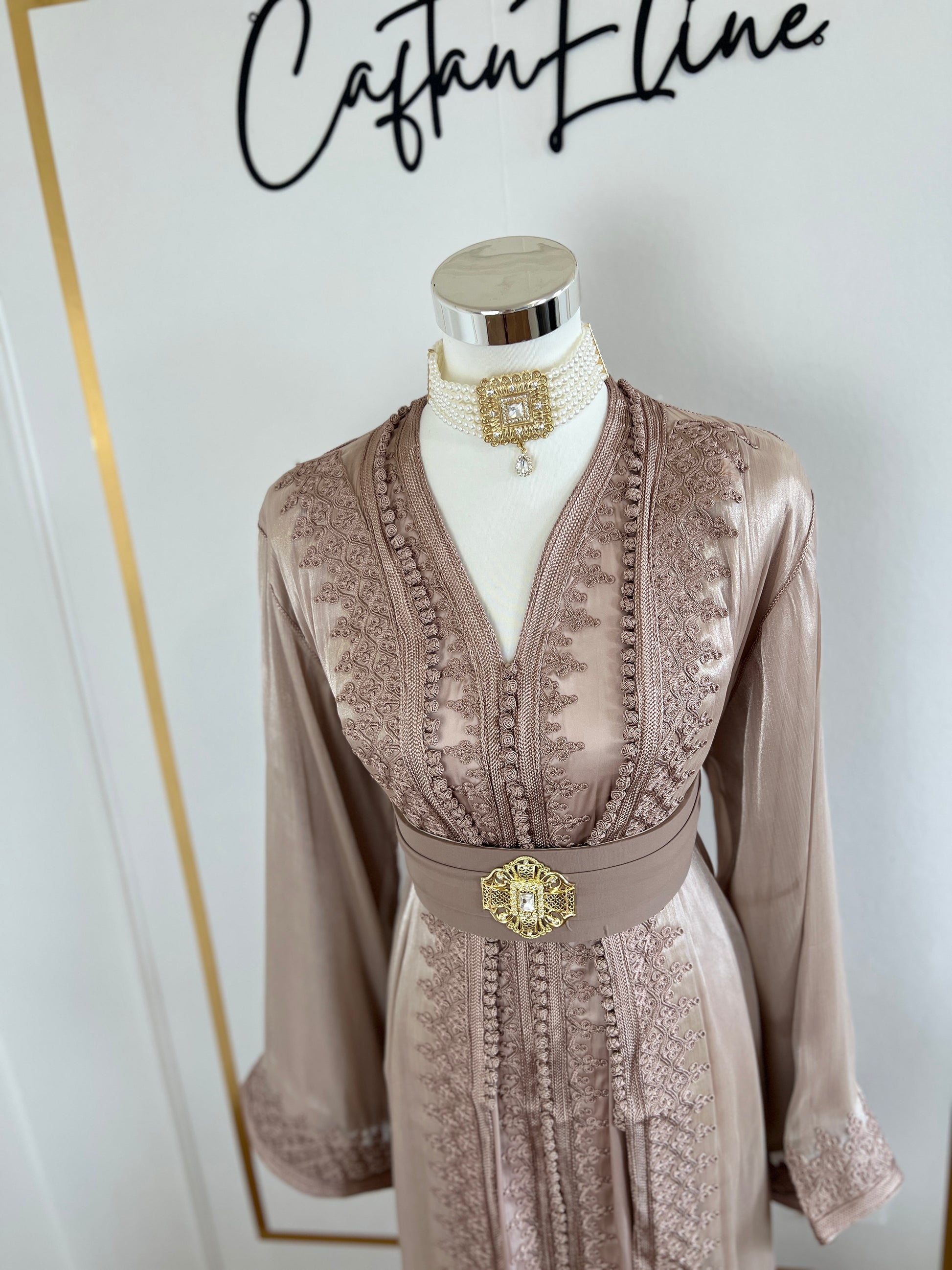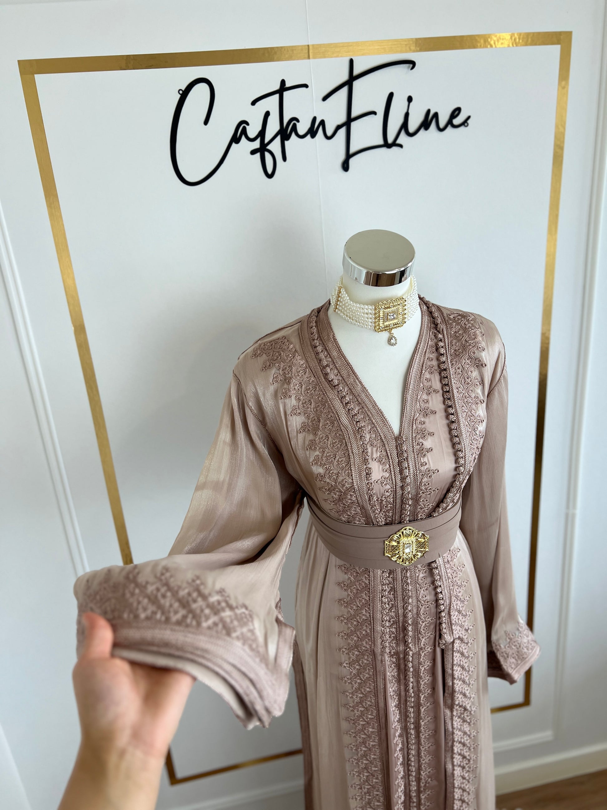 this caftan combines the charm of Moroccan craftsmanship with a contemporary touch,