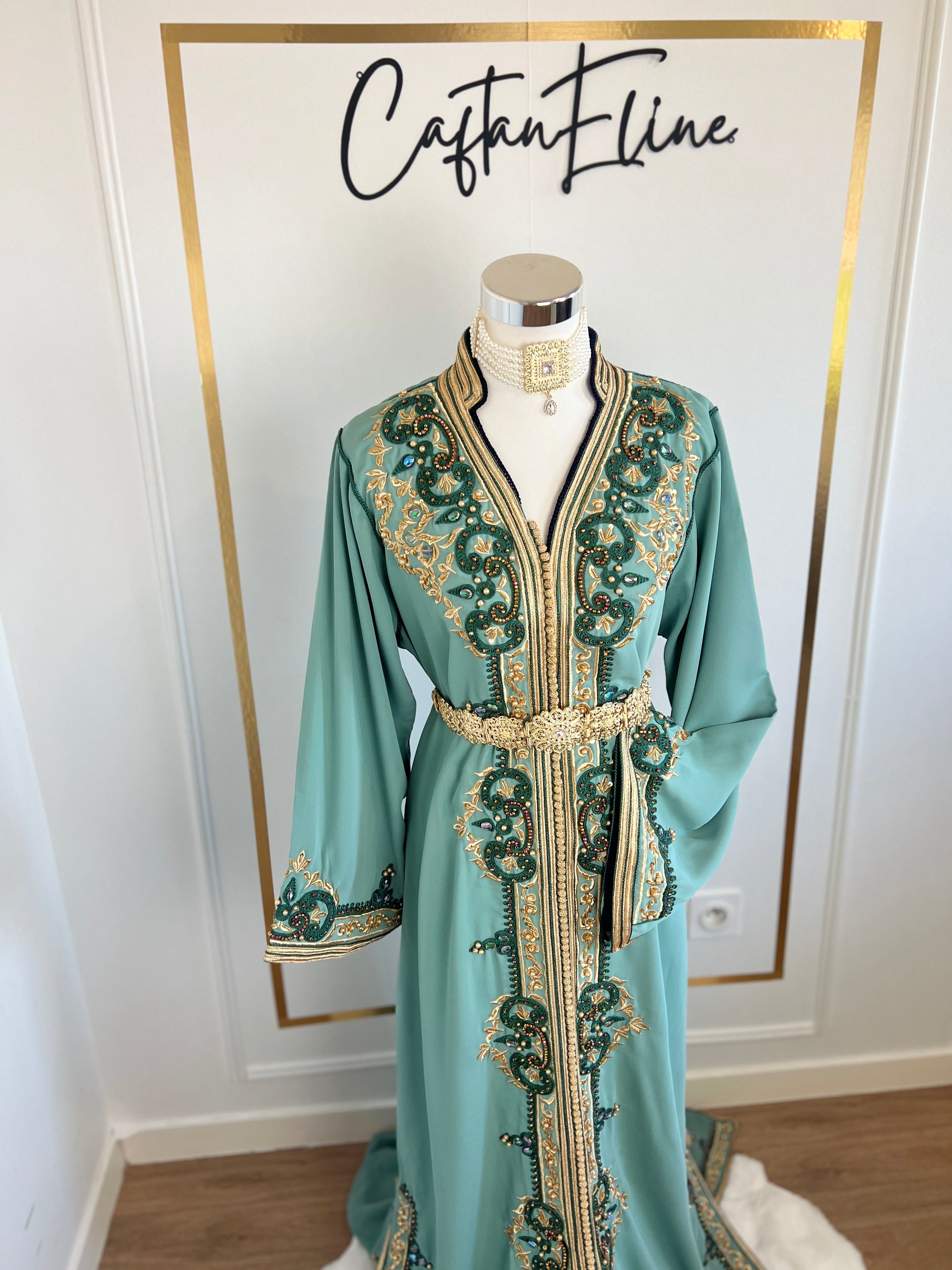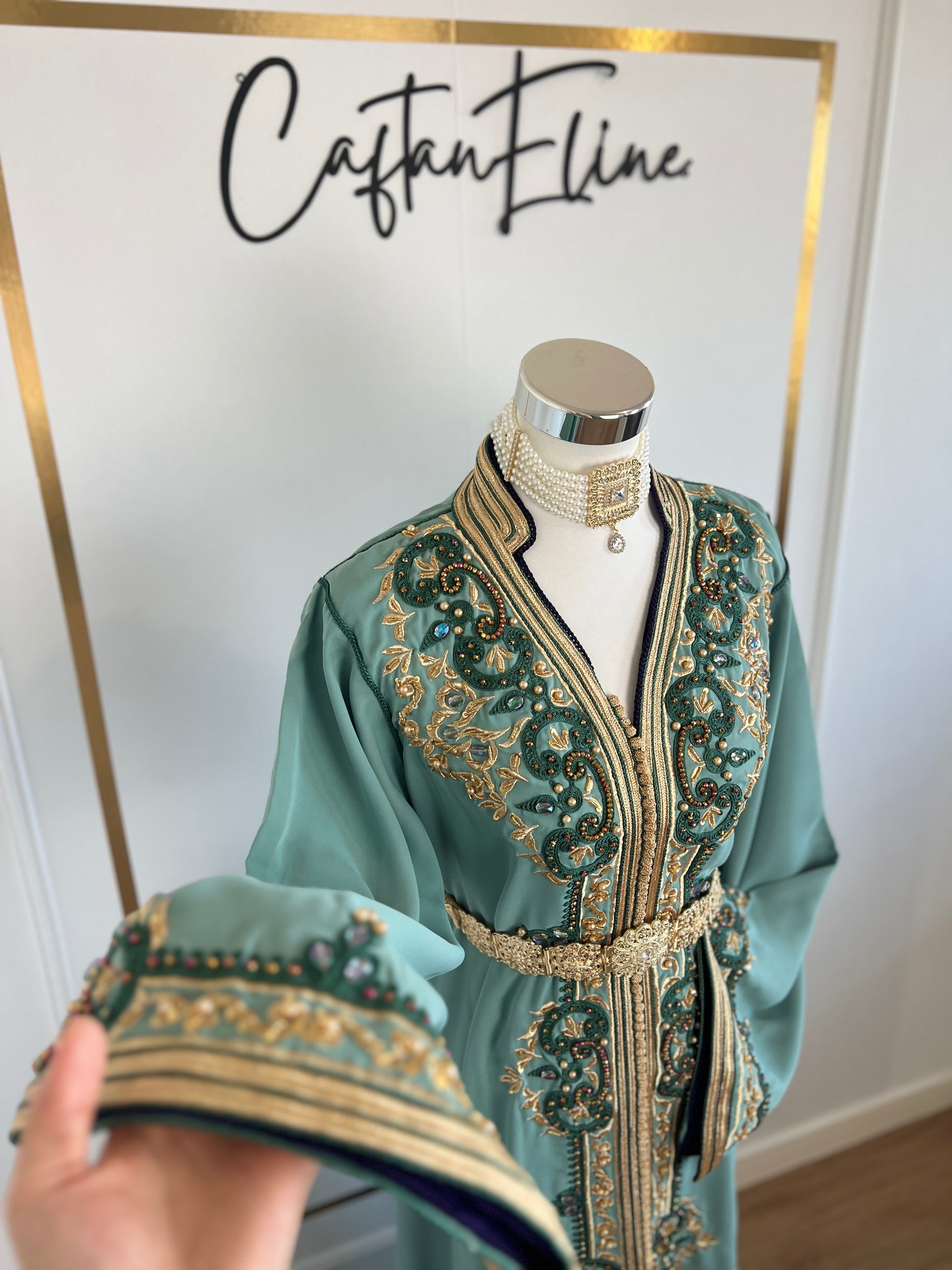 this caftan combines the charm of Moroccan craftsmanship with a contemporary touch,