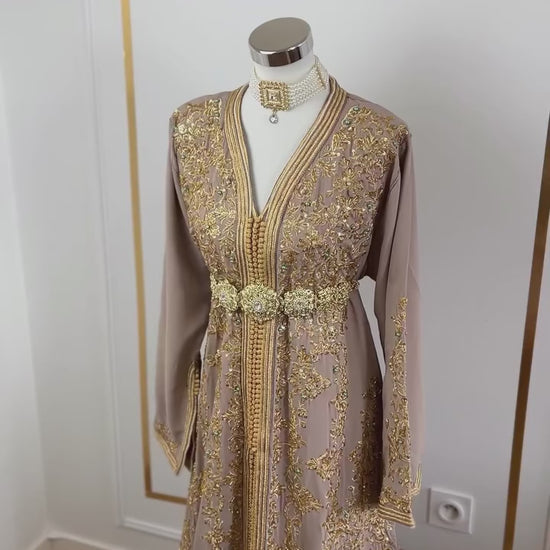 this caftan combines the charm of Moroccan craftsmanship with a contemporary touch,