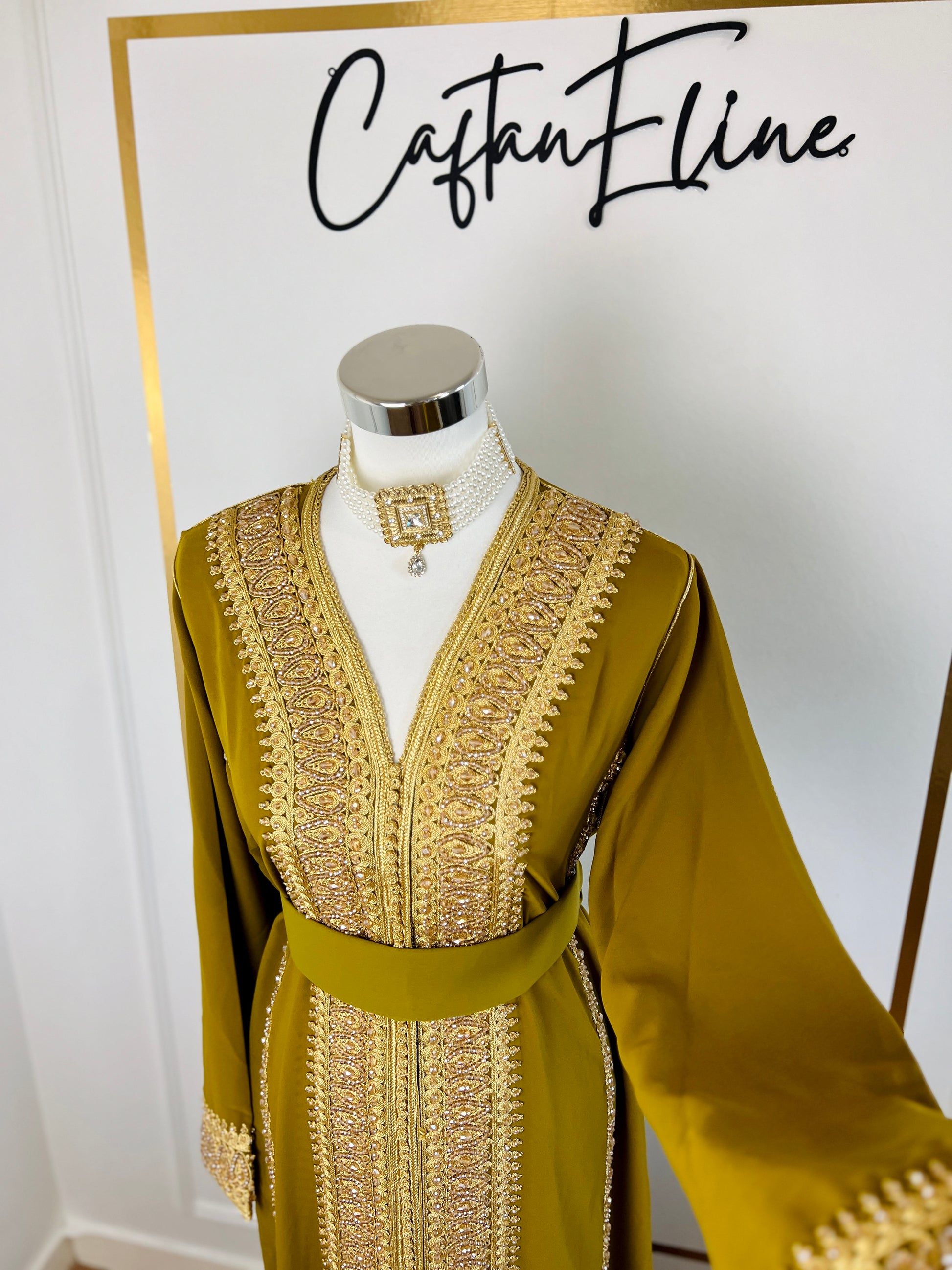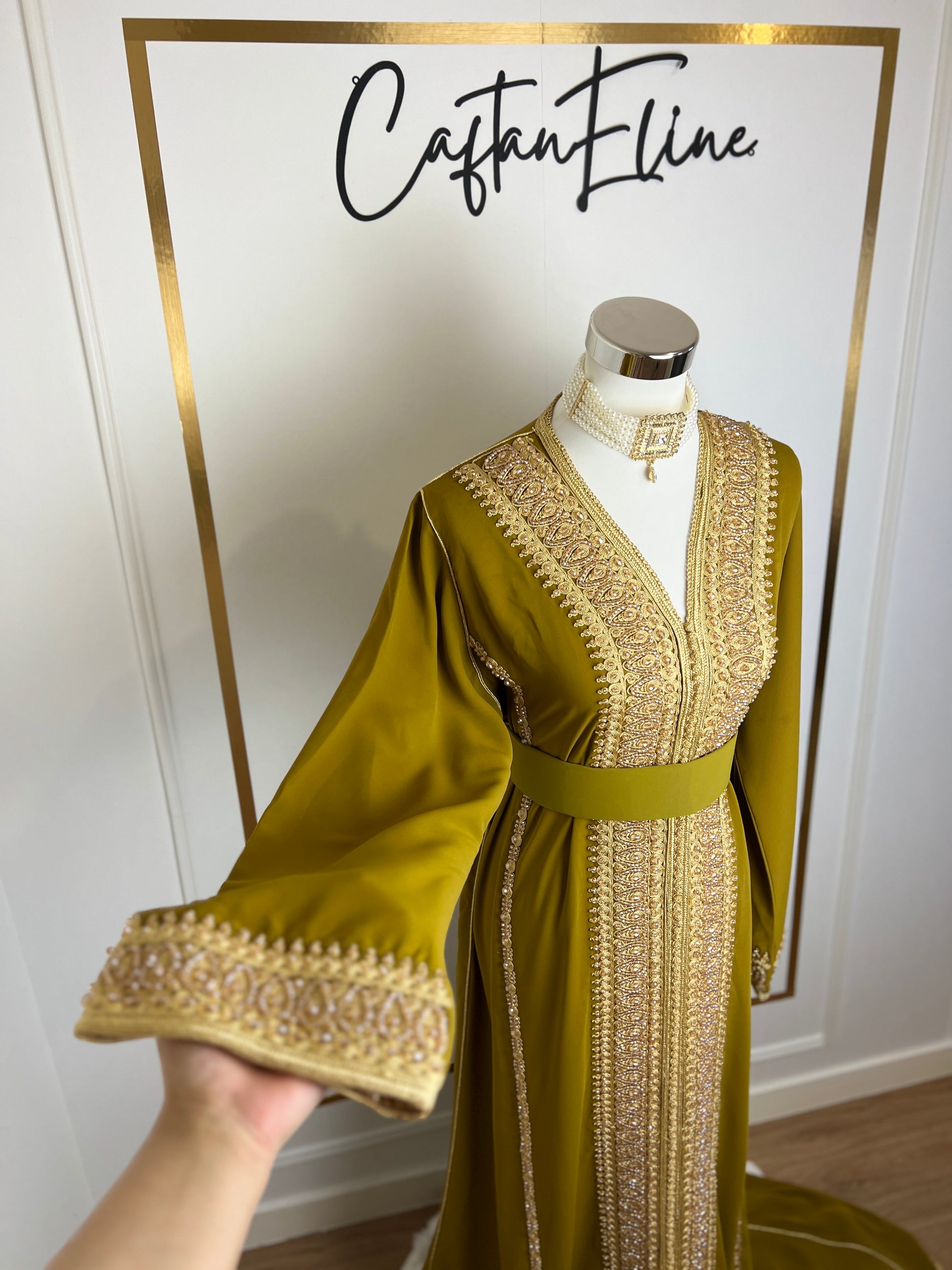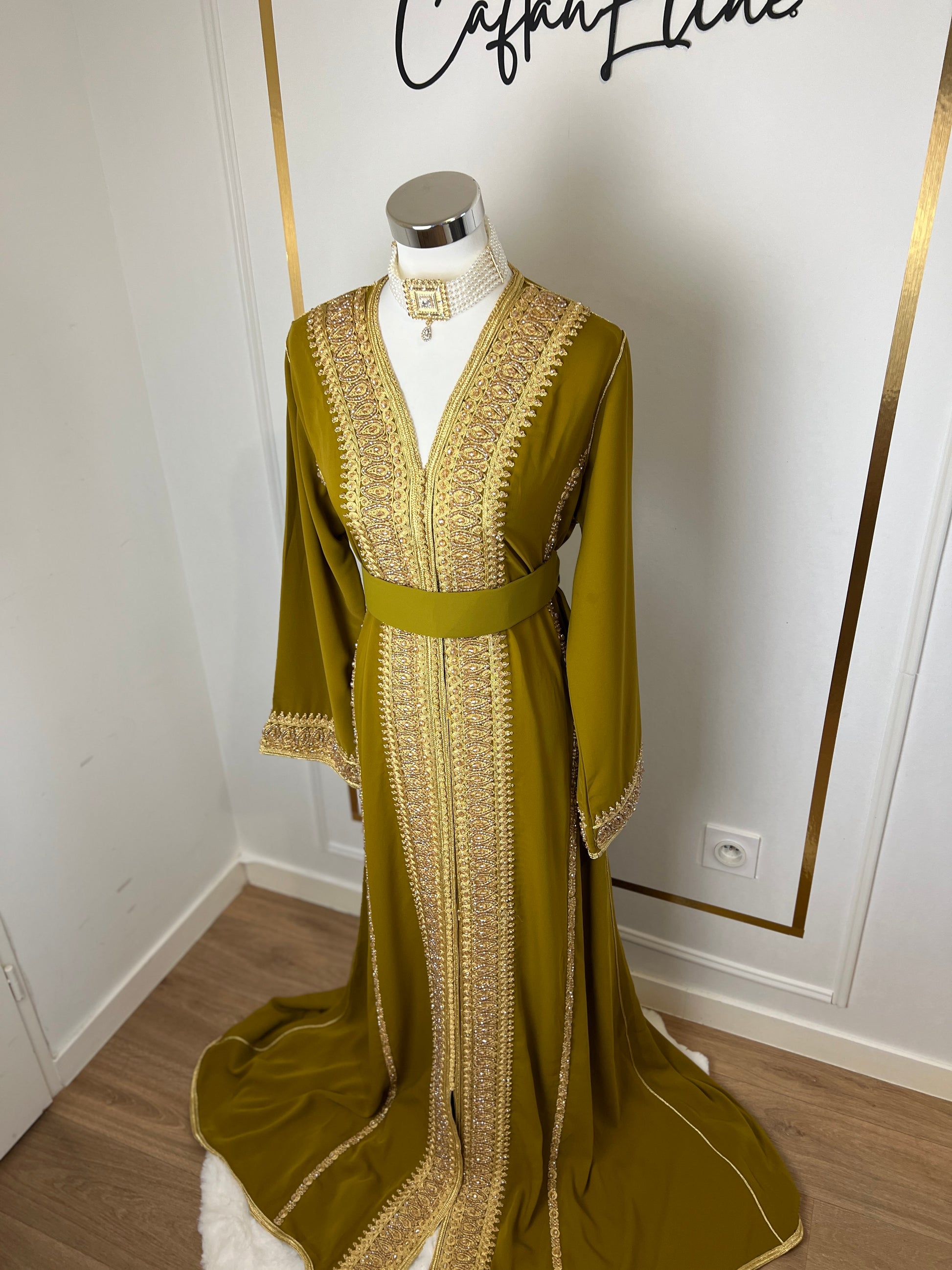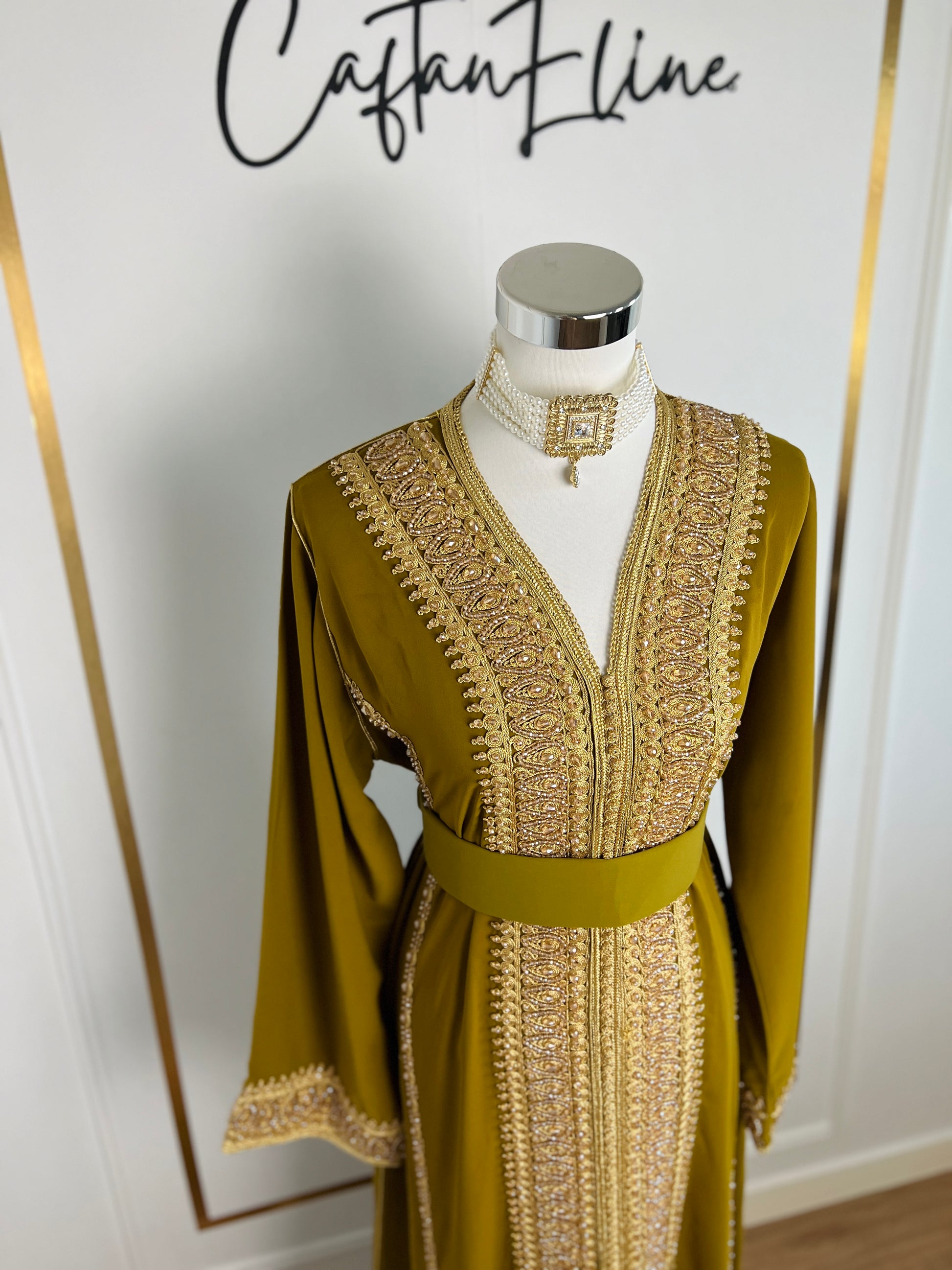 this caftan combines the charm of Moroccan craftsmanship with a contemporary touch,