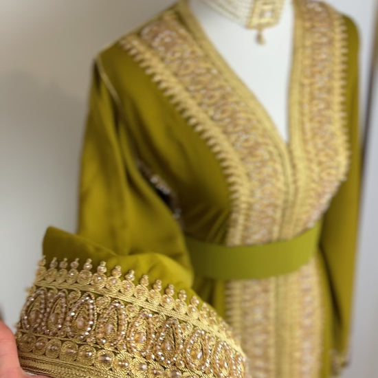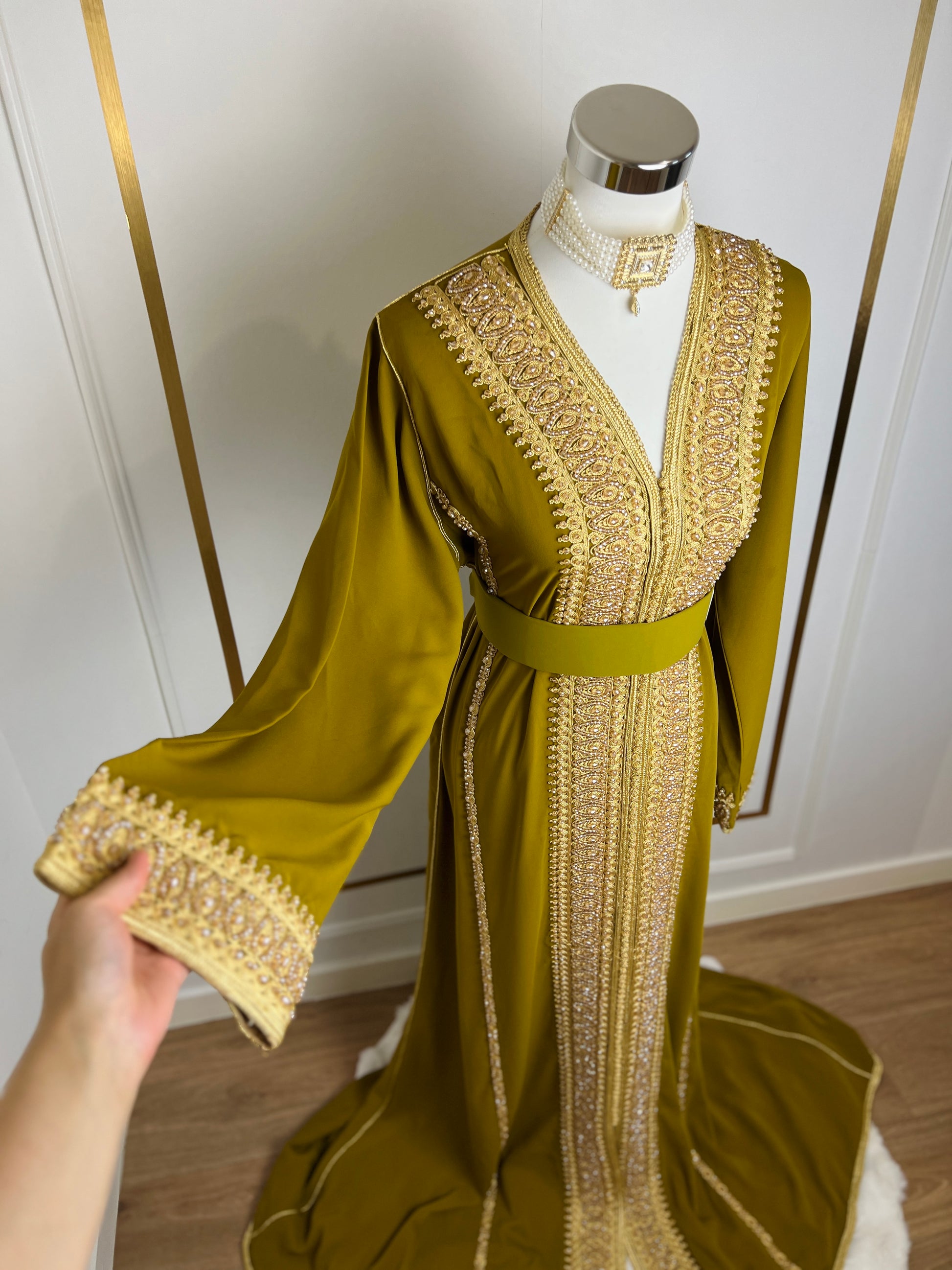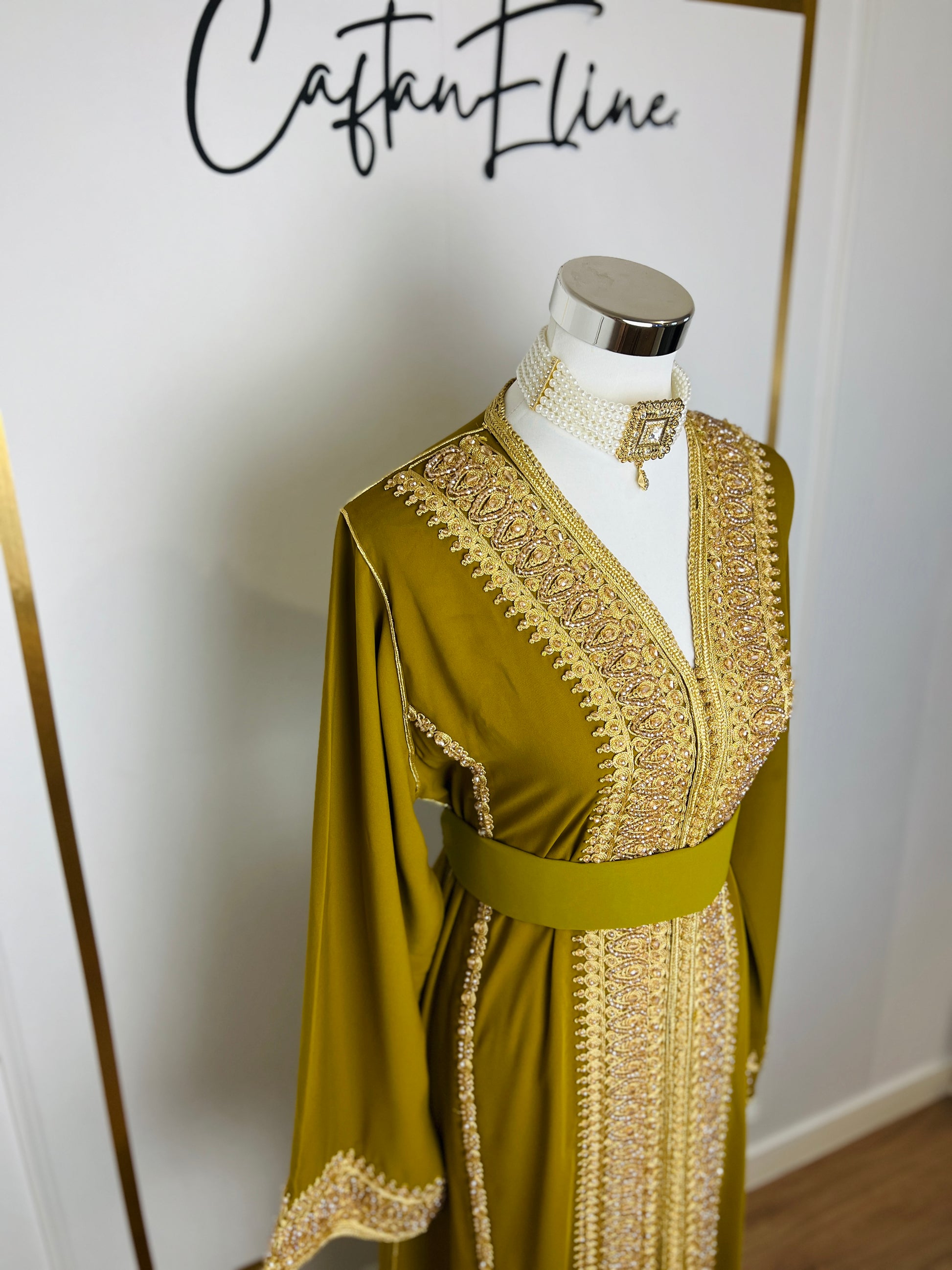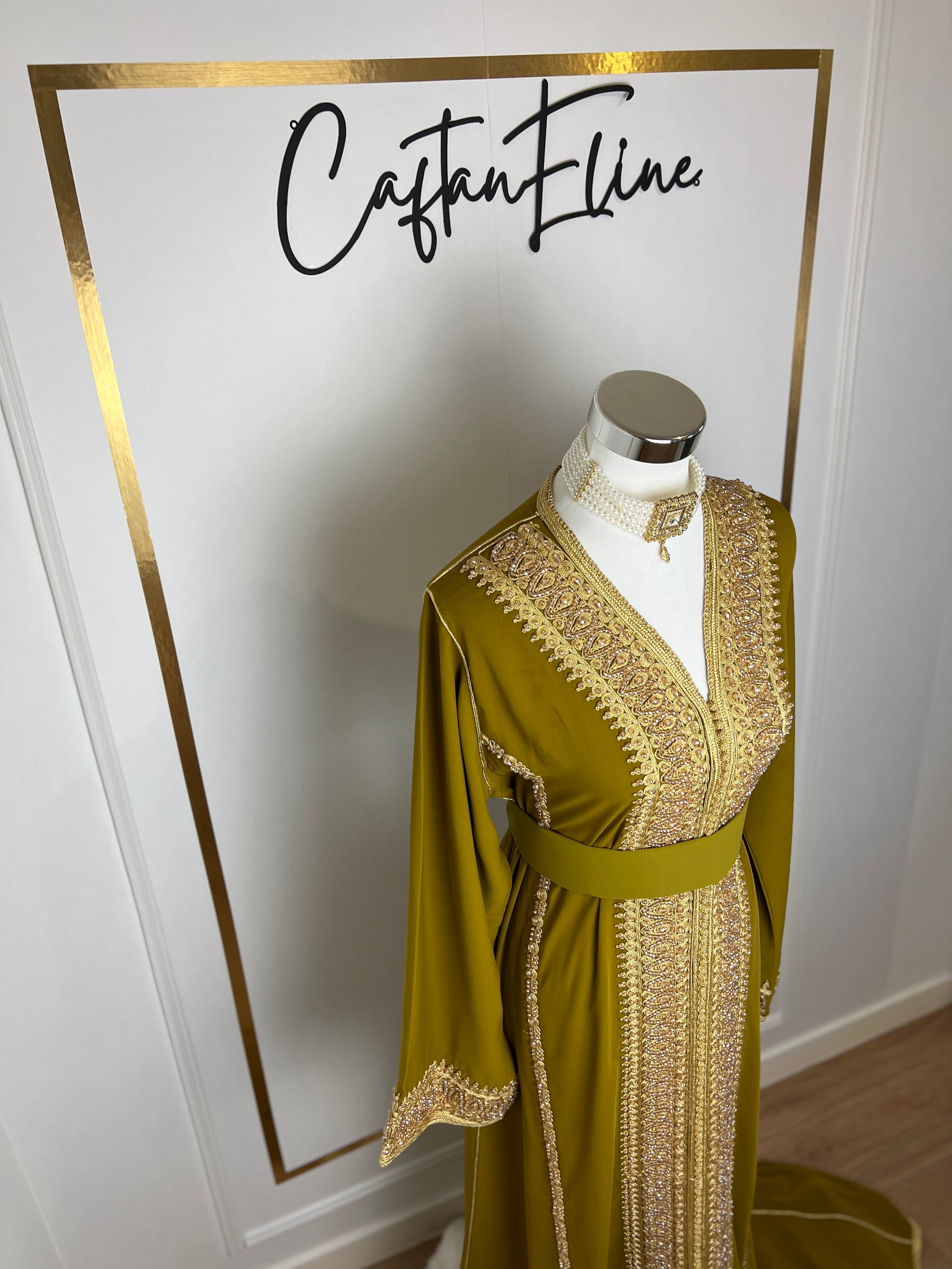 this caftan combines the charm of Moroccan craftsmanship with a contemporary touch,