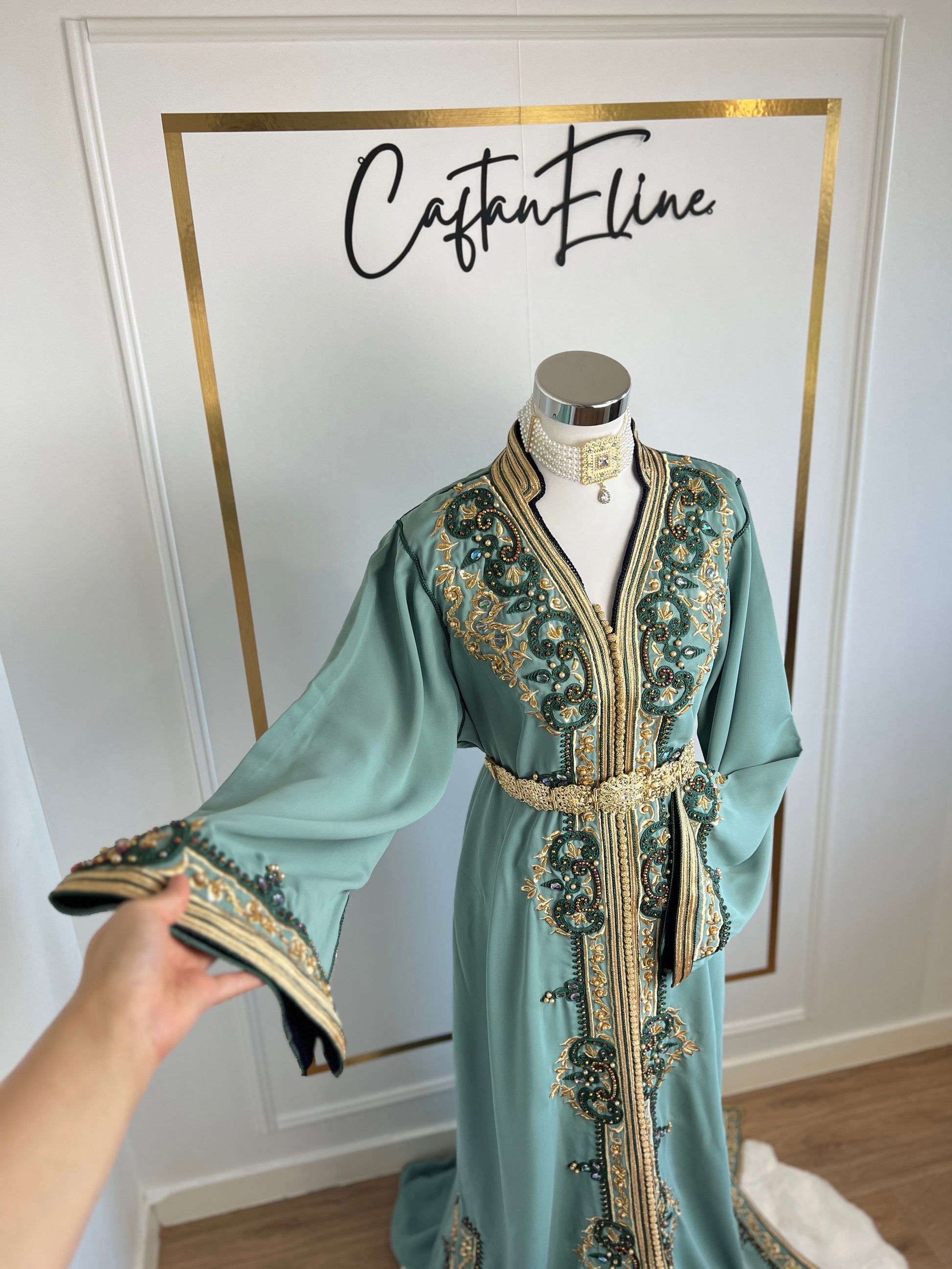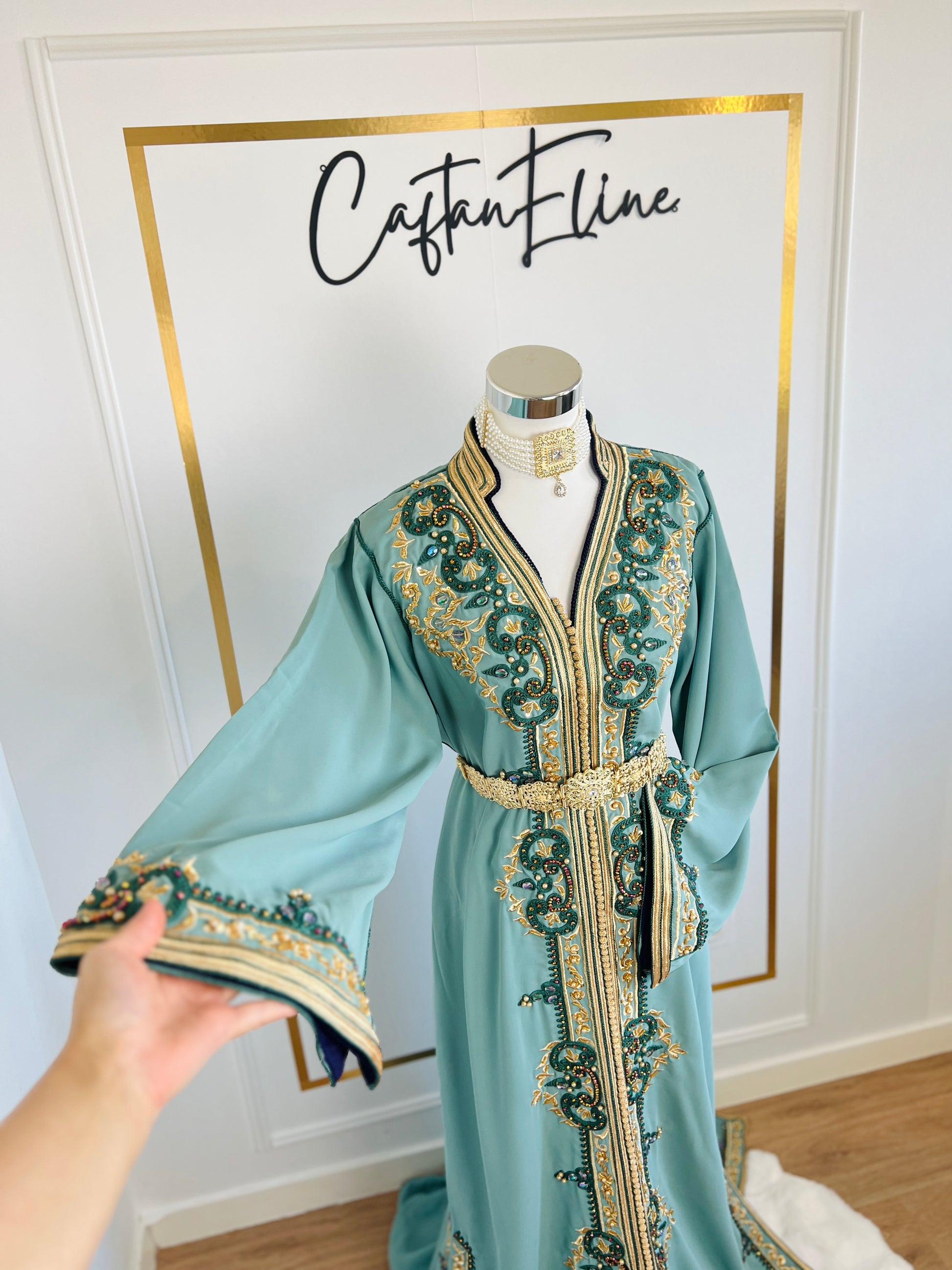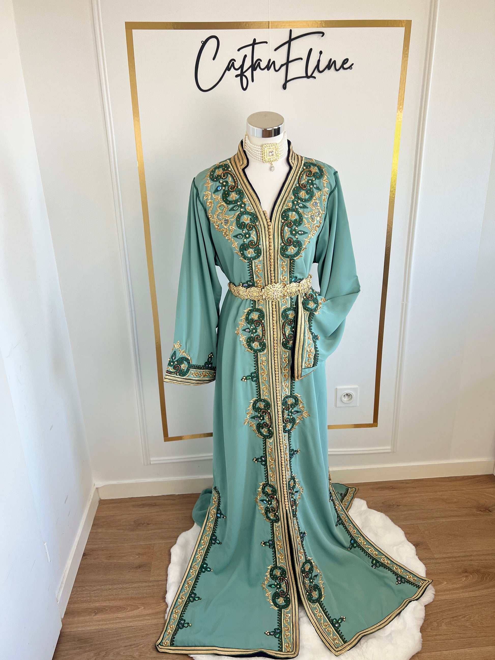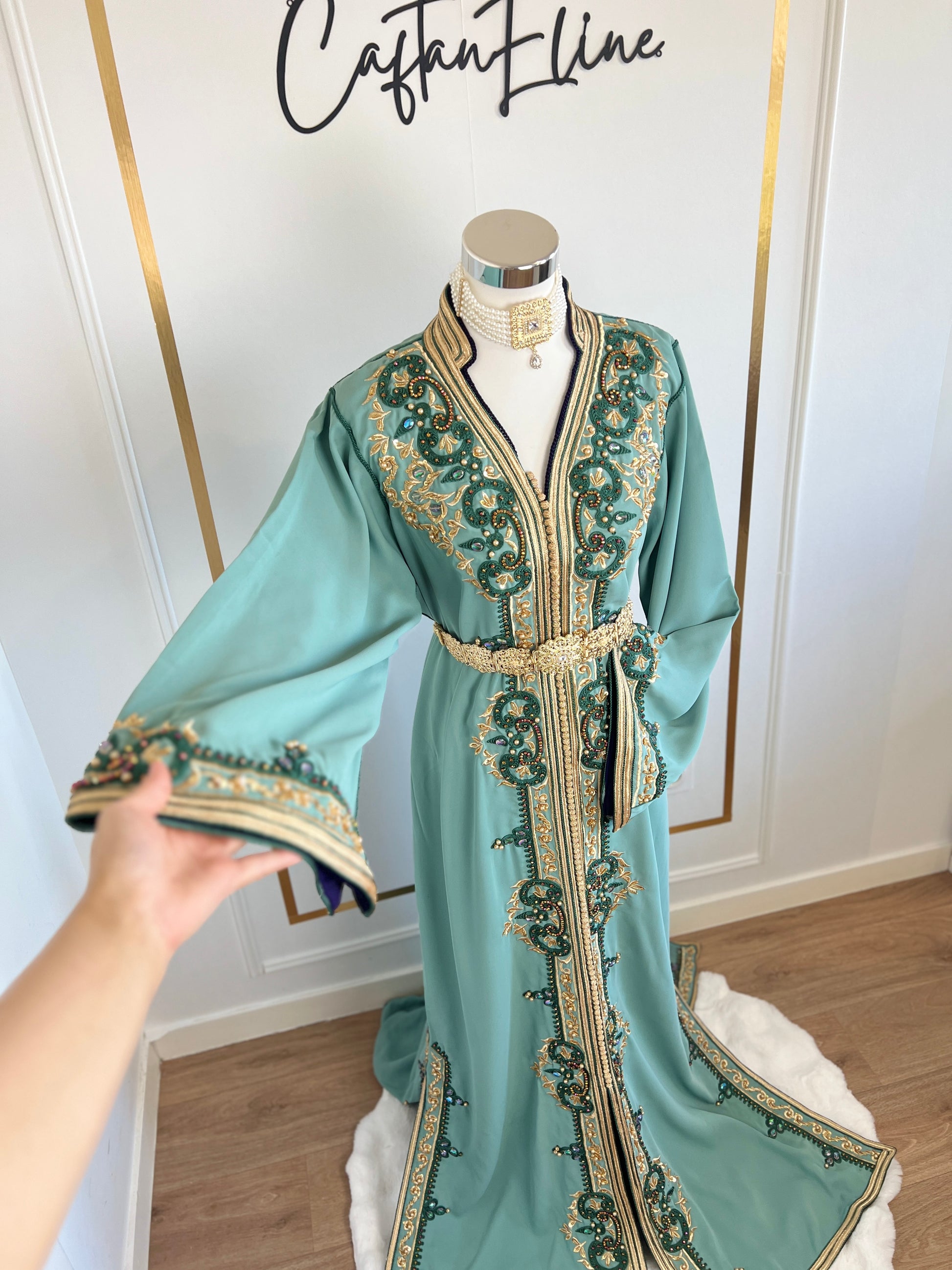 this caftan combines the charm of Moroccan craftsmanship with a contemporary touch,